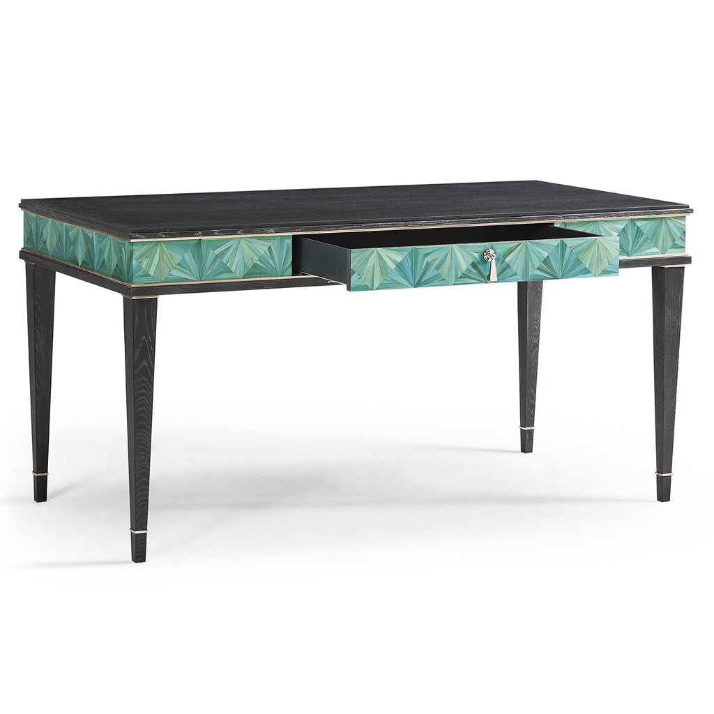 The Azura Desk is a stunning showcase of modern craftsmanship and elegance. Its front features intricate straw marquetry in vibrant turquoise tones, hand-applied to create a mesmerizing starburst pattern. The marquetry is beautifully outlined in satin-finished stainless steel metal banding, adding a sleek, polished contrast to the natural texture. The desk's frame and legs are finished in rich ebonized oak, providing a sophisticated contrast to complement the striking design. With hand-cast hardware and ample workspace, the Sapphire Desk combines artistic beauty with functional sophistication, making it a perfect centerpiece for any office or study.