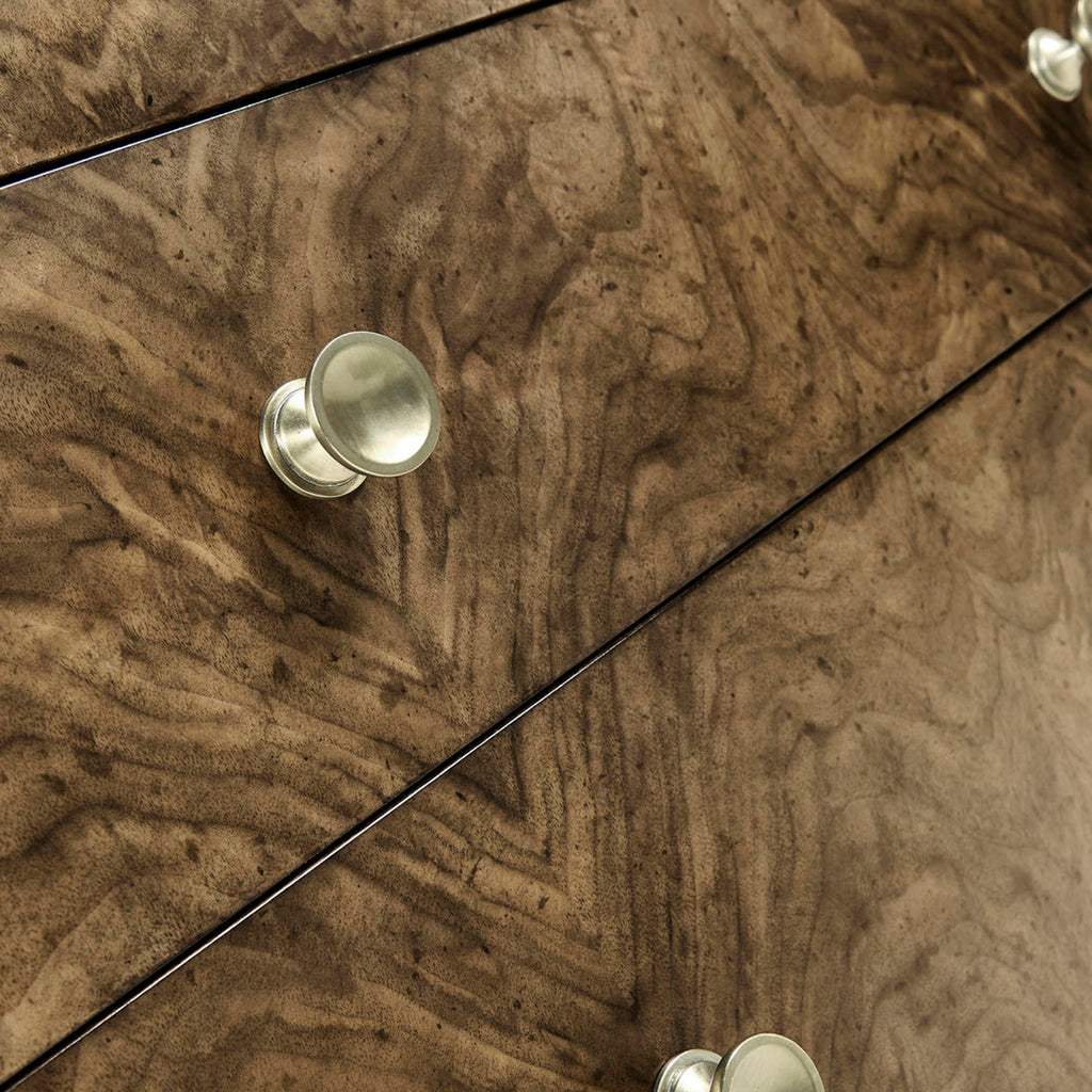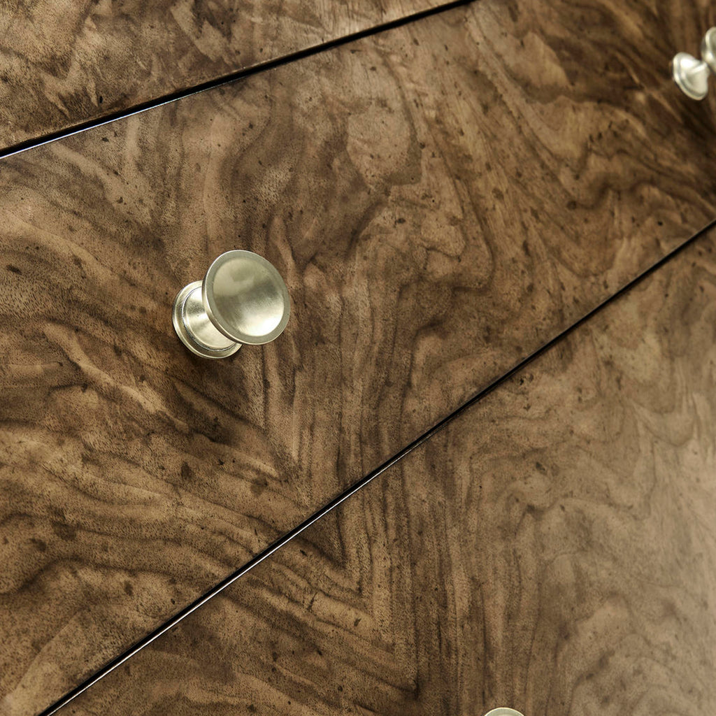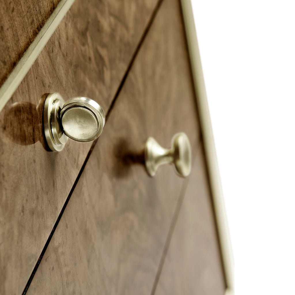 The cabinet is constructed of walnut with a transparent, low luster finish. Drawer fronts feature walnut swirl in a traditional book match pattern. Hardware is cast in our foundry and finished in a light, champagne patina. Drawers include soft close mechanisms.