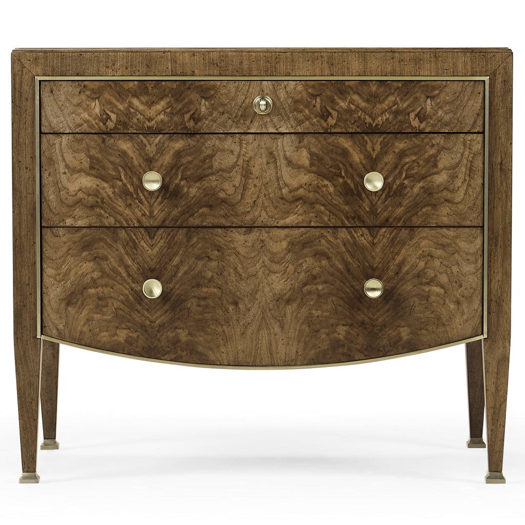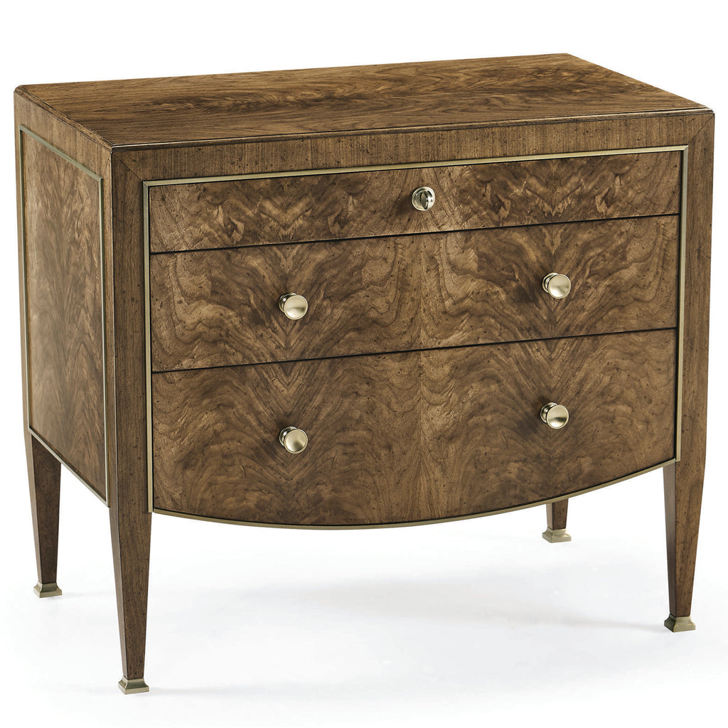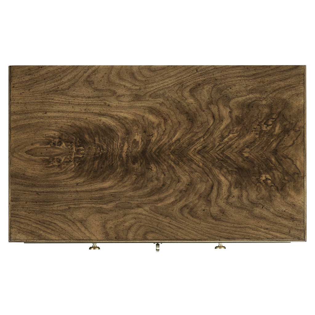 The cabinet is constructed of walnut with a transparent, low luster finish. Drawer fronts feature walnut swirl in a traditional book match pattern. Hardware is cast in our foundry and finished in a light, champagne patina. Drawers include soft close mechanisms.