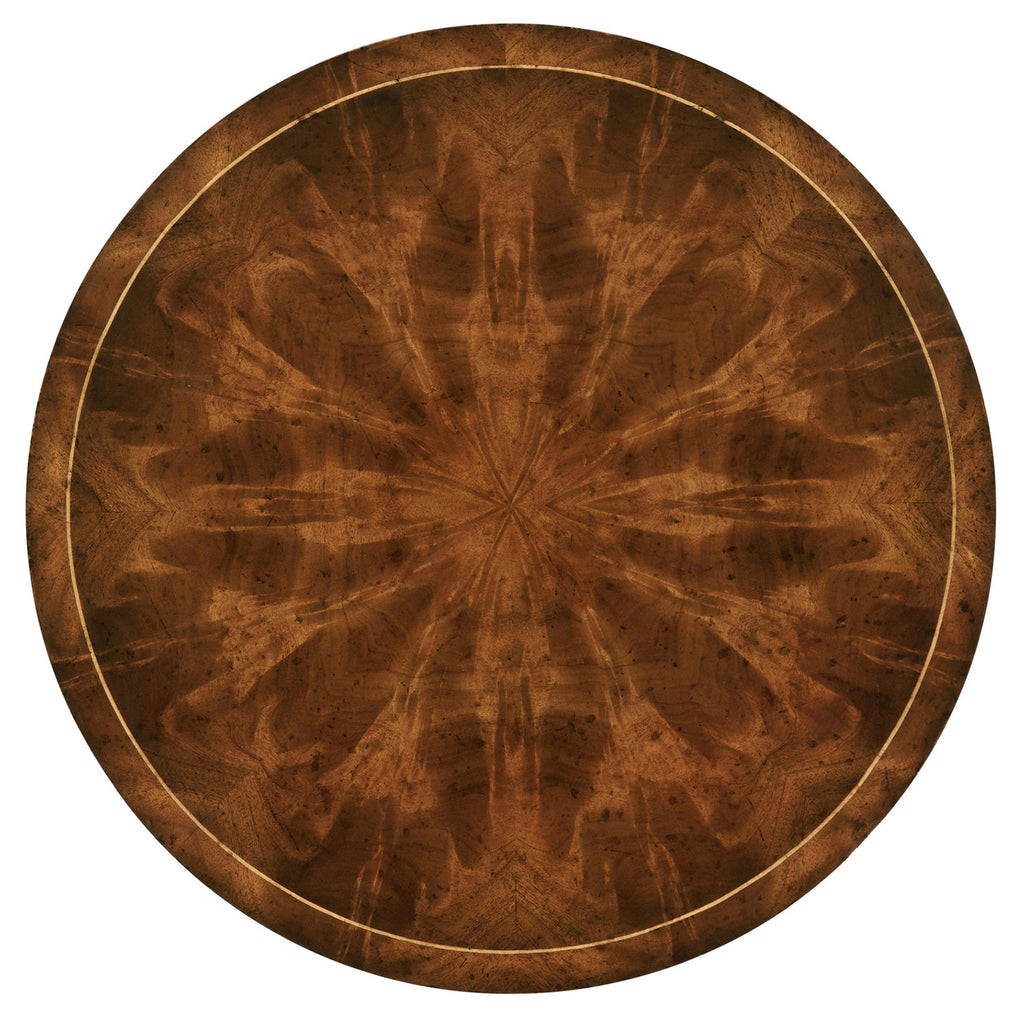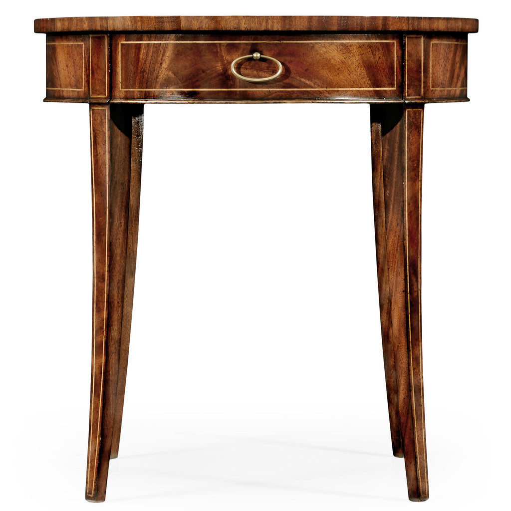 Classically styled round mahogany side table using the finest crotch veneers and standing on tapering legs. Contrasting light stringing inlay throughout. The drawer is finished with a hand cast brass oval handle.
