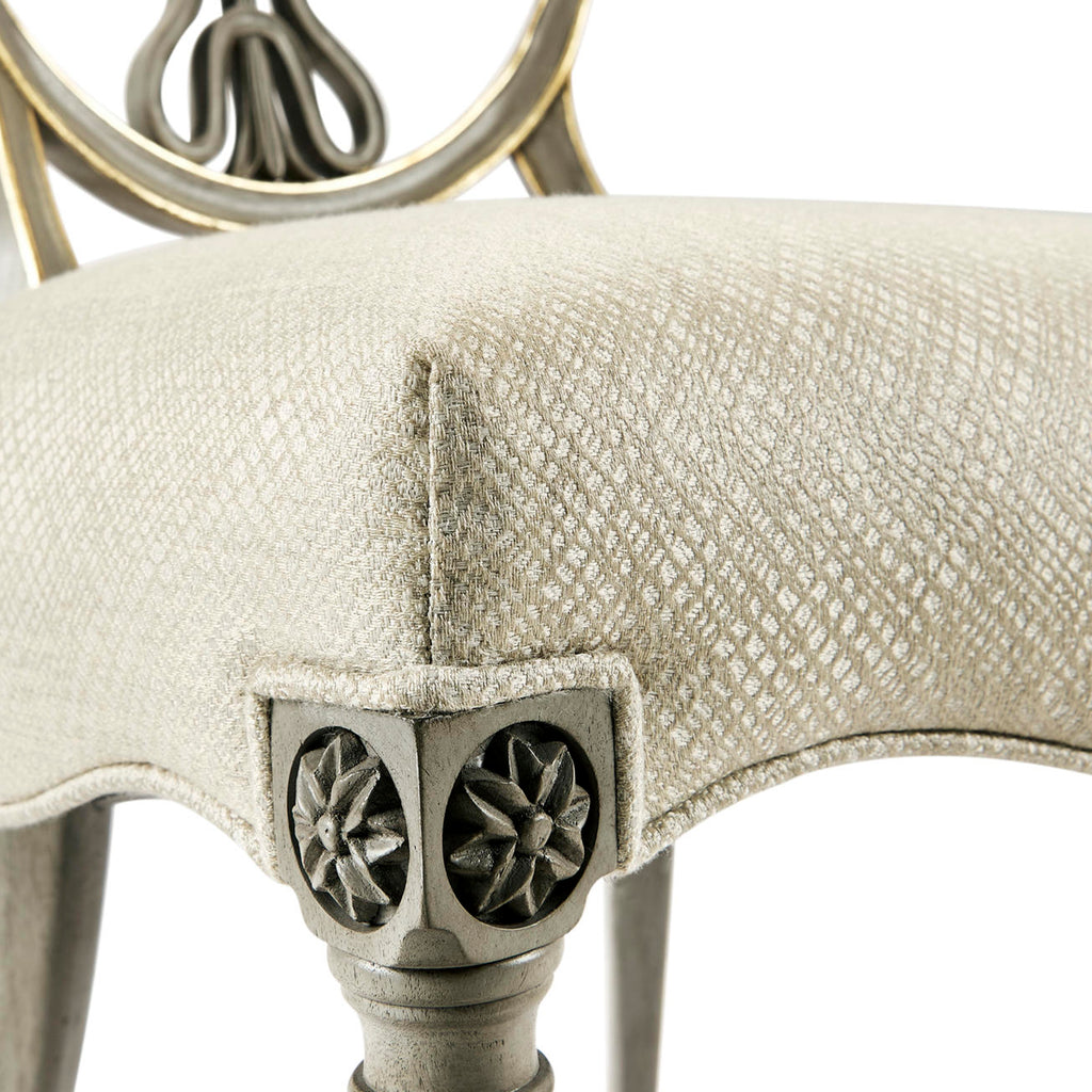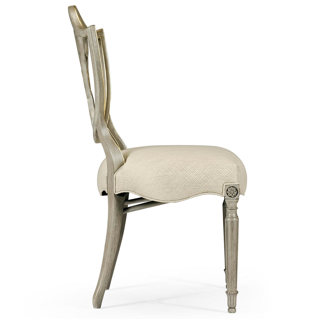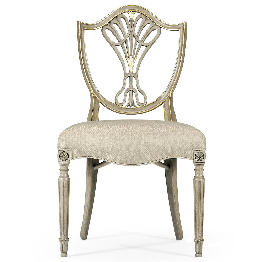 Jonathan Charles Buckingham Sheraton dining side chair with classic painted shield back in buckingham gray and gilded details. Frame is covered in a Jonathan Charles performance fabric Skipper