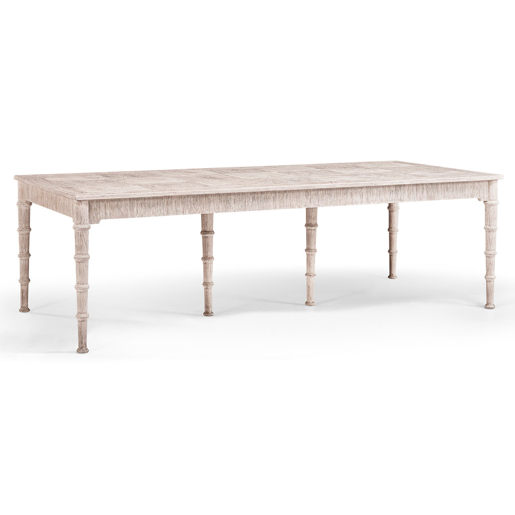 The Bywater Extending Dining Table combines classic design with modern versatility, finished in a warm Washed Acacia for a refined, natural look. Its stunning tabletop features a reeded wood parquet pattern, adding texture and visual interest, while the reeded apron enhances its timeless elegance. Supported by beautifully turned legs, this table exudes traditional charm and craftsmanship. Designed for both intimate meals and larger gatherings, the Bywater Dining Table extends to an impressive 139 inches with the addition of two butterfly leaves, making it a functional and stylish centerpiece for any dining space.