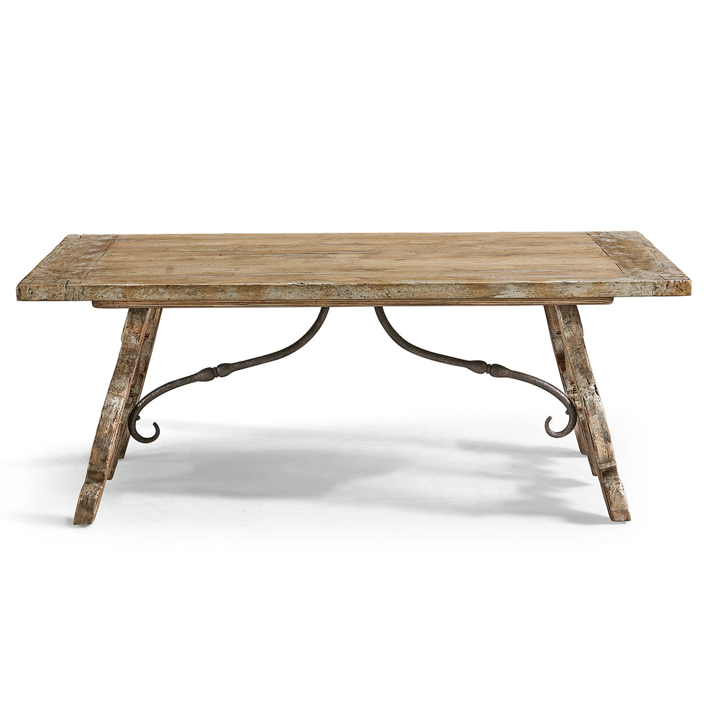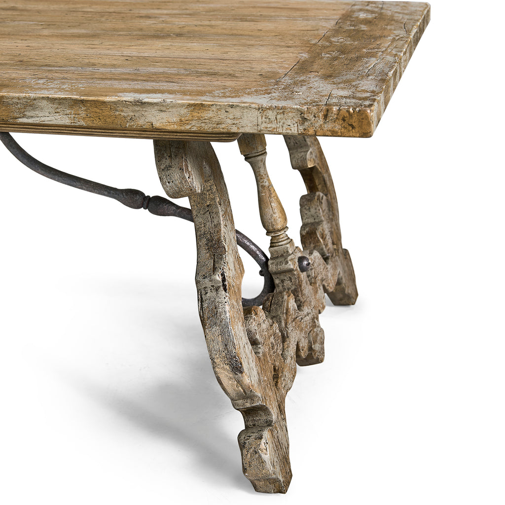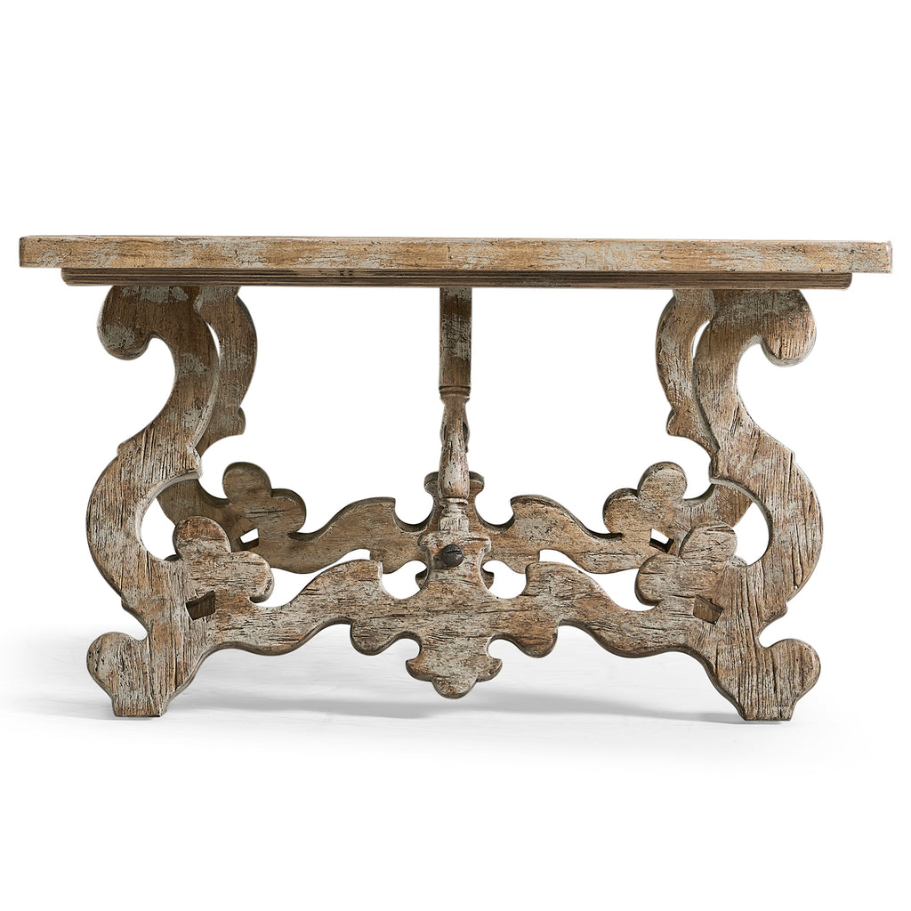 The Caldera Curved-Base Cocktail Table brings a refined blend of classic charm and functionality to your living space. Featuring a distinctive Spanish-style silhouette and masterful craftsmanship, this table is constructed from greyed oak wood with painted accents offering a rustic yet elegant antique appeal.