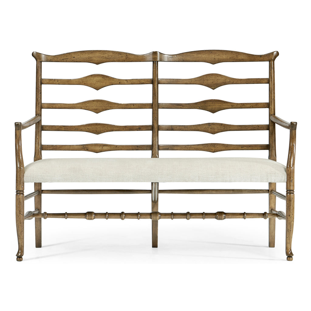 Country style medium driftwood ladder back two seat bench with shaped back rail, graduated ladder slats with triangular shaping in the center and an upholstered seat. Turned legs and stretchers beneath.