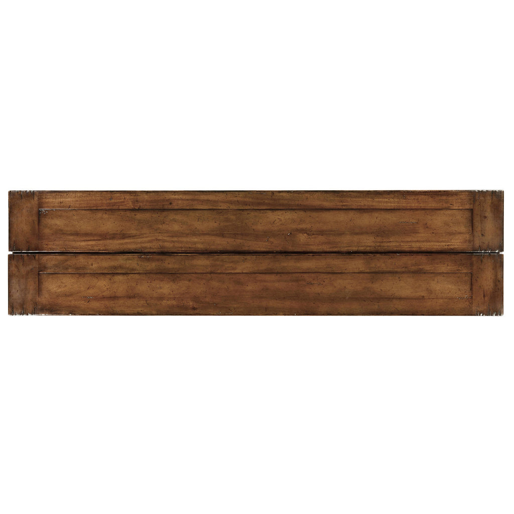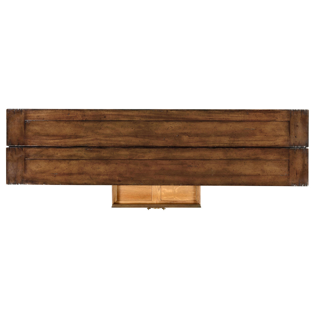 Walnut hunt table that folds out to reveal antique brass hinges and planked top. Seats: 6.