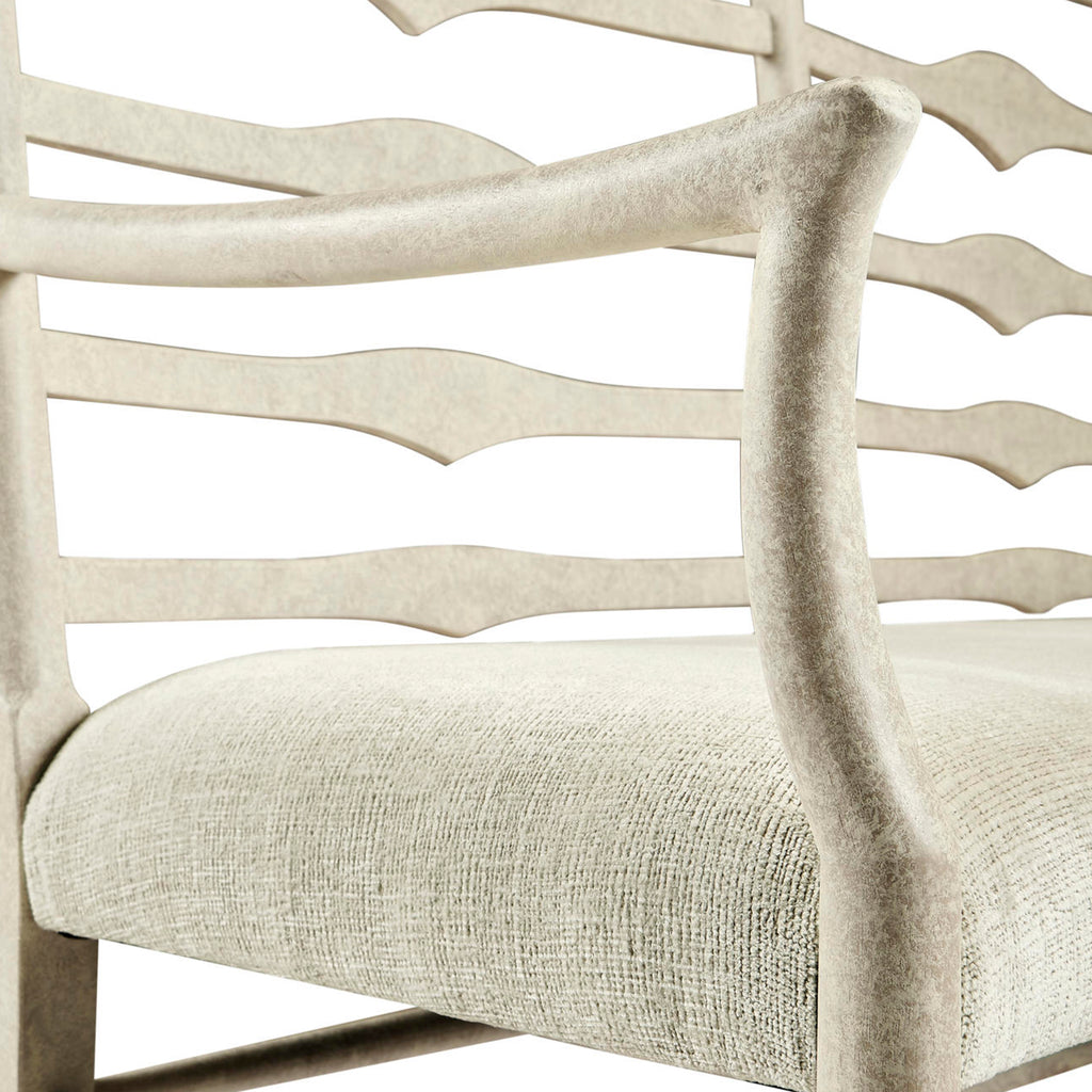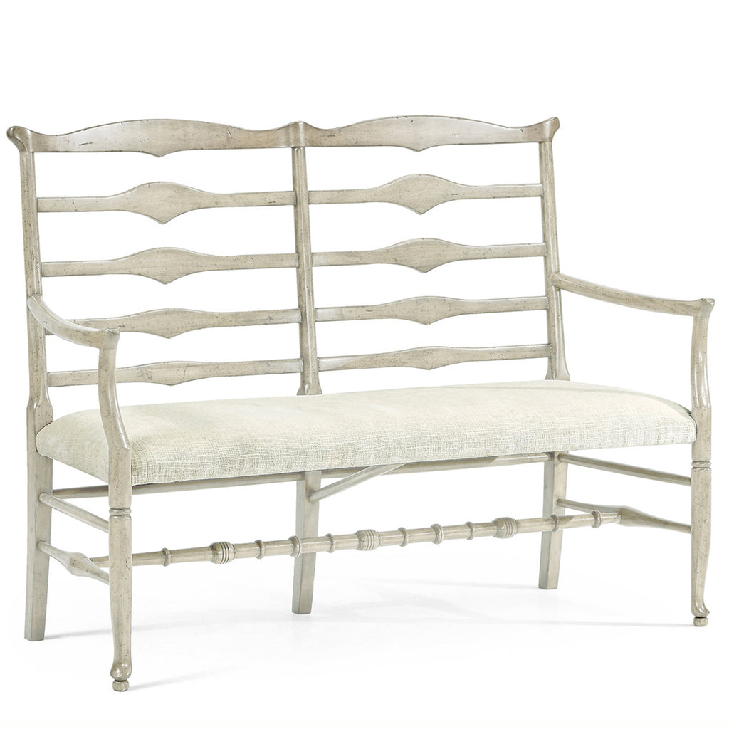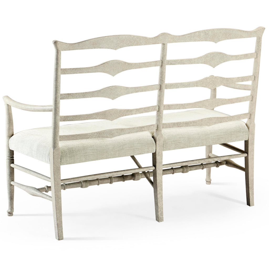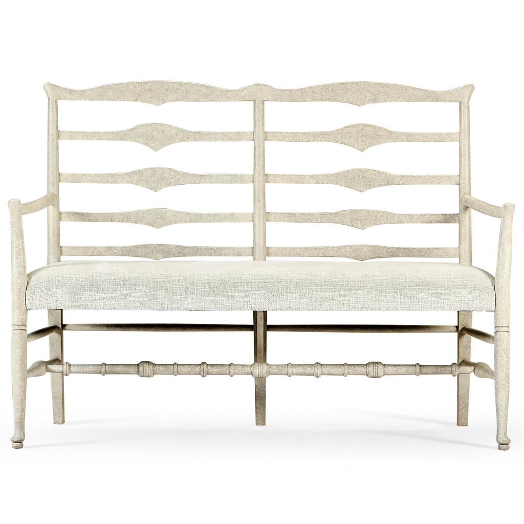 Country style whitewash driftwood ladder back two seat bench with shaped back rail, graduated ladder slats with triangular shaping in the center and an upholstered seat. Turned legs and stretchers beneath.