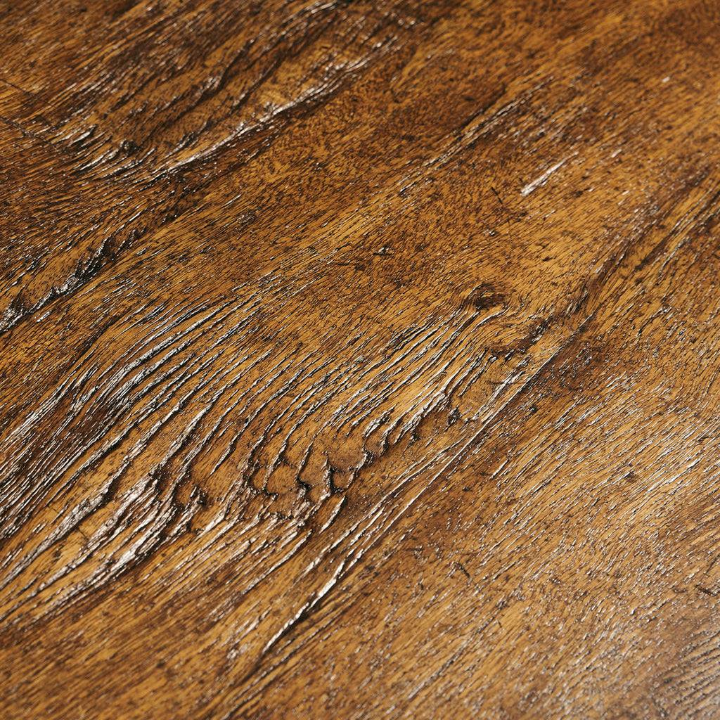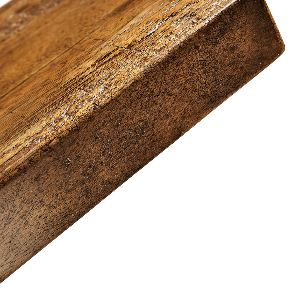 Narrow rectangular console table with a rustic finish showing exposed saw marks and of a traditional construction in country walnut.