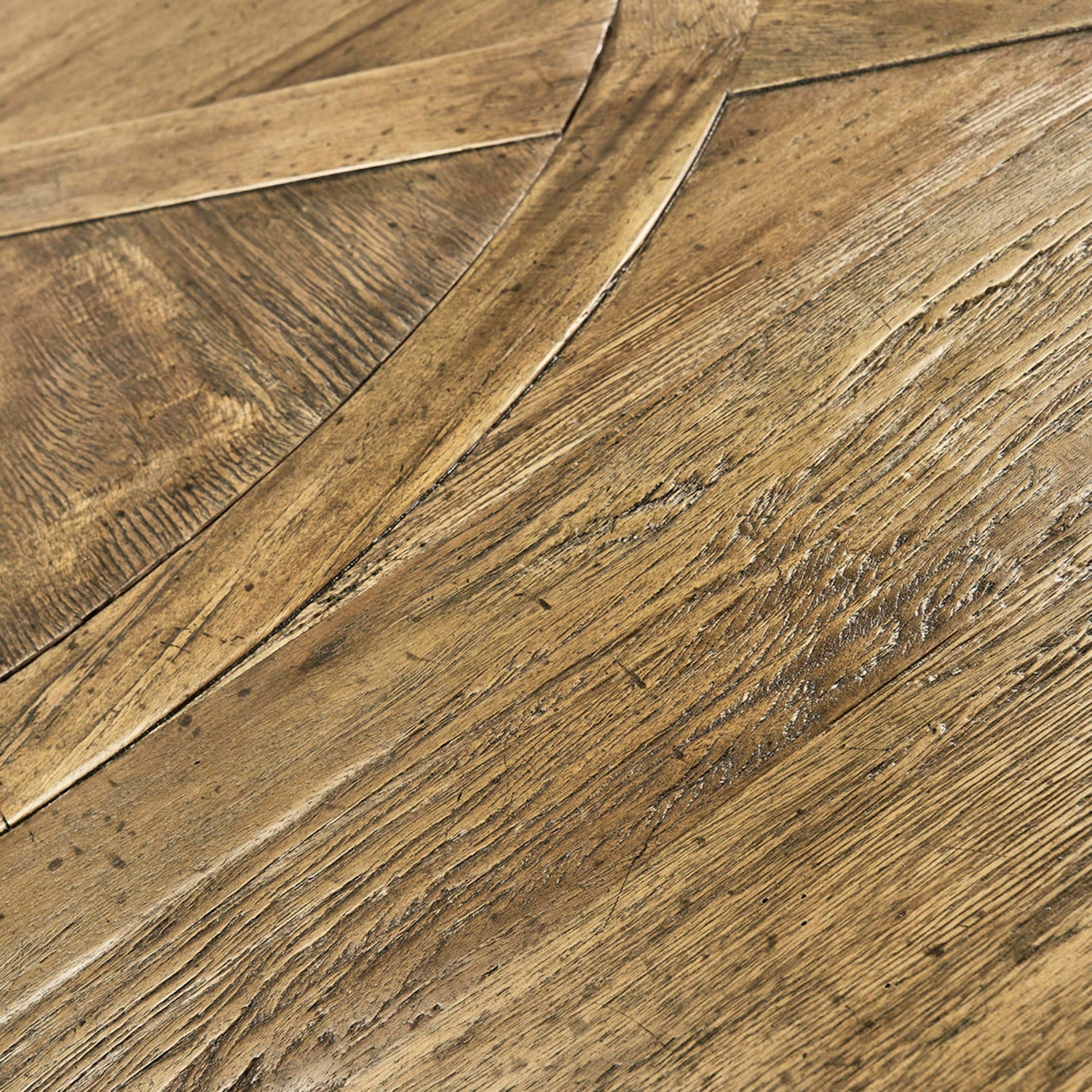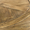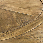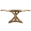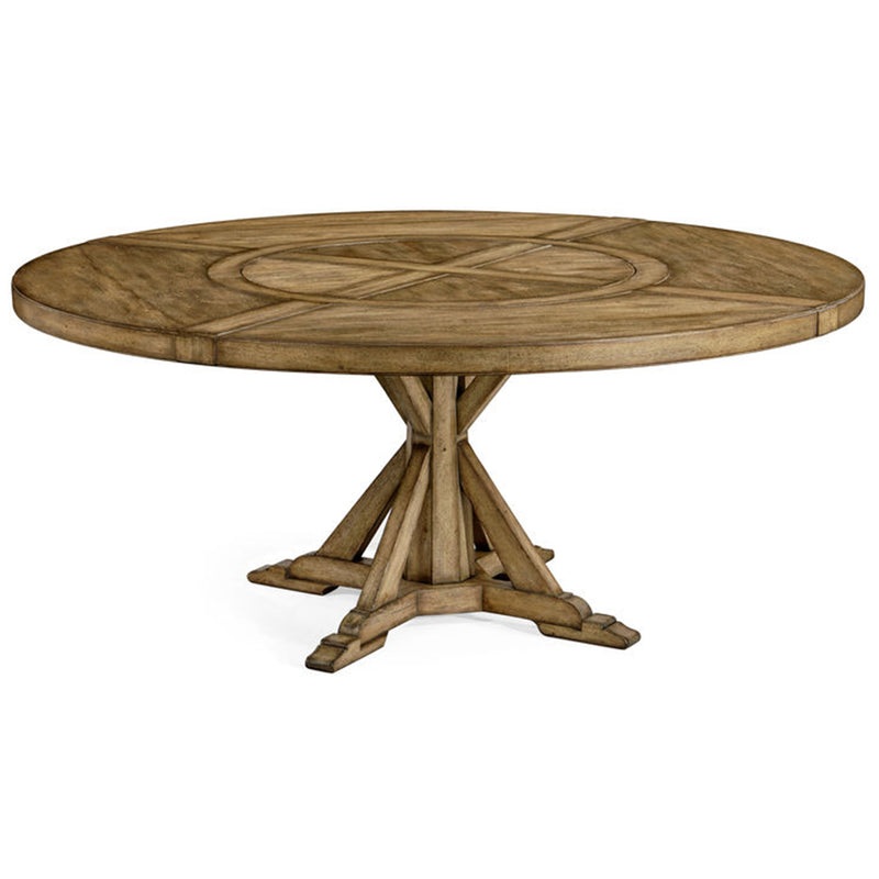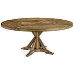 72" Solid medium brown driftwood topped circular dining table with a rustic finish showing exposed saw marks and set on a bracketed country kitchen base, the table containing an ingenious mechanism of a self-storing lazy susan within.