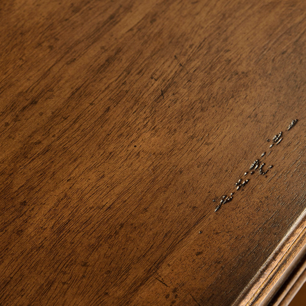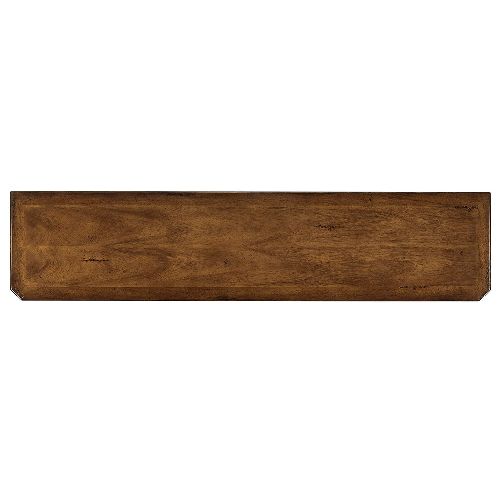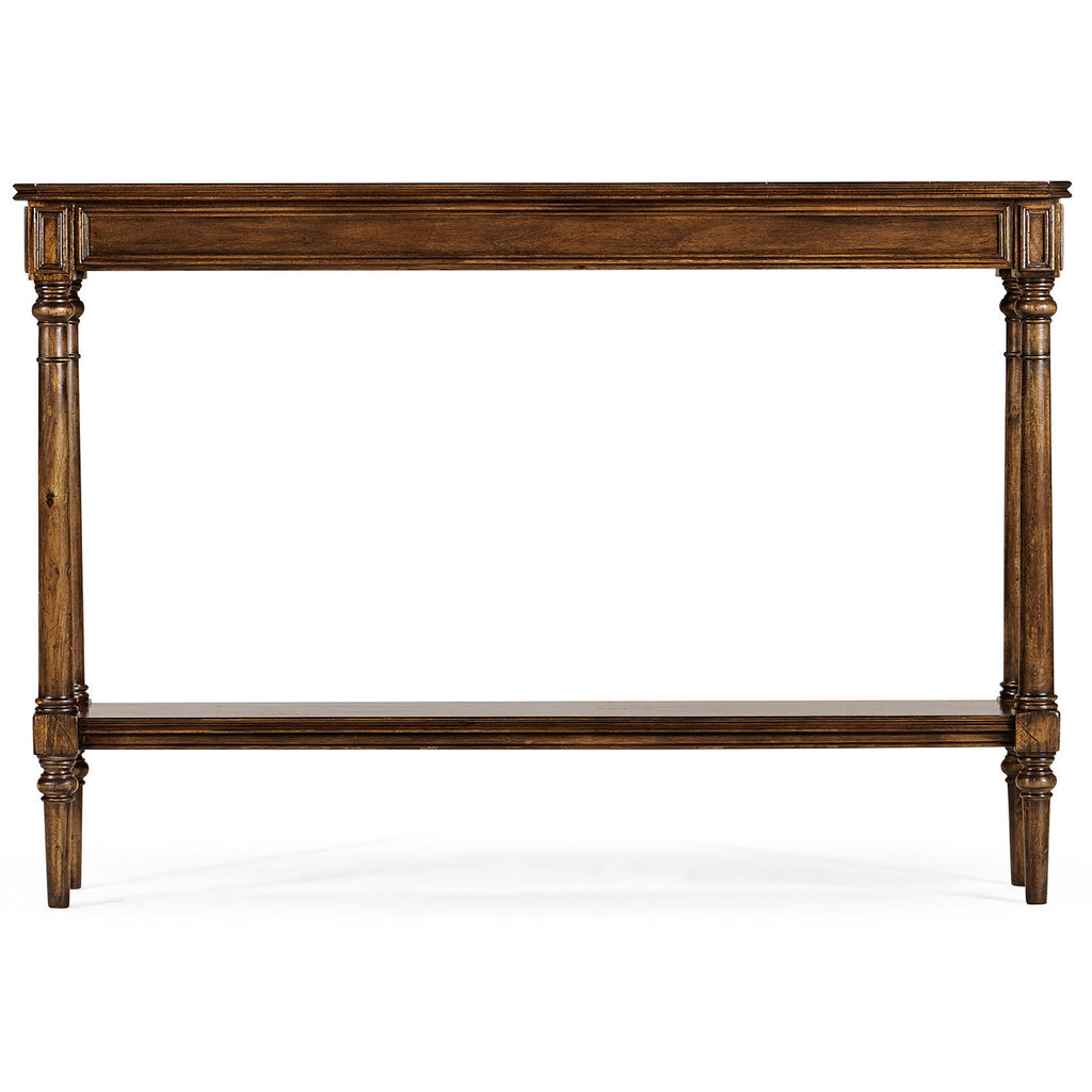 Restrained design narrow console table in distressed walnut, the canted rectangular top set between tapering baluster legs and an under tier beneath.