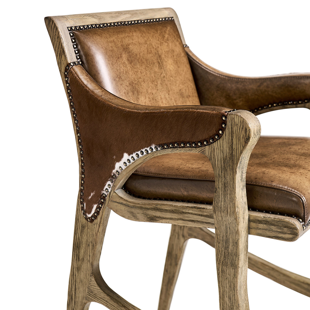 The Echo Canyon Bar Stool showcases luxurious hand-stained leather upholstery, highlighted by distinctive cowhide accents along the outer arms. The nail head trim outlining the leather adds a refined yet natural touch, giving the stool its unique character. Built with a solid wood frame and finished in a warm faded oak, this stool combines durability with rustic elegance, making it a perfect complement to any heritage-style home.CRAFTED FROM NATURAL HIDES, EACH PIECE FEATURES UNIQUE VARIATIONS IN PATTERN AND COLOR, ENSURING NO TWO ARE EXACTLY ALIKE. A ONE-OF-A-KIND STATEMENT OF AUTHENTICITY AND STYLE.
