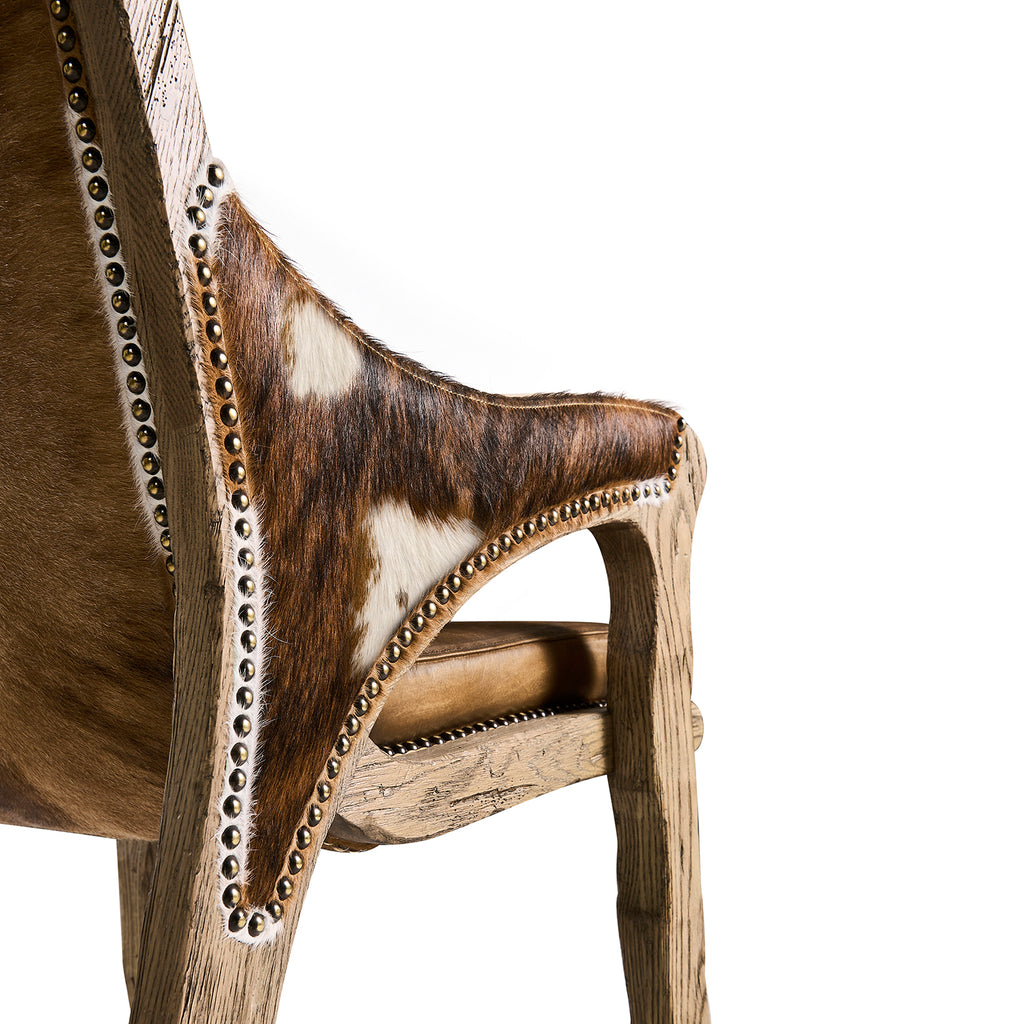 The Echo Canyon Counter Stool showcases luxurious hand-stained leather upholstery, highlighted by distinctive cowhide accents along the outer arms. The nail head trim outlining the leather adds a refined yet natural touch, giving the stool its unique character. Built with a solid wood frame and finished in a warm faded oak, this stool combines durability with rustic elegance, making it a perfect complement to any heritage-style home. CRAFTED FROM NATURAL HIDES, EACH PIECE FEATURES UNIQUE VARIATIONS IN PATTERN AND COLOR, ENSURING NO TWO ARE EXACTLY ALIKE. A ONE-OF-A-KIND STATEMENT OF AUTHENTICITY AND STYLE.