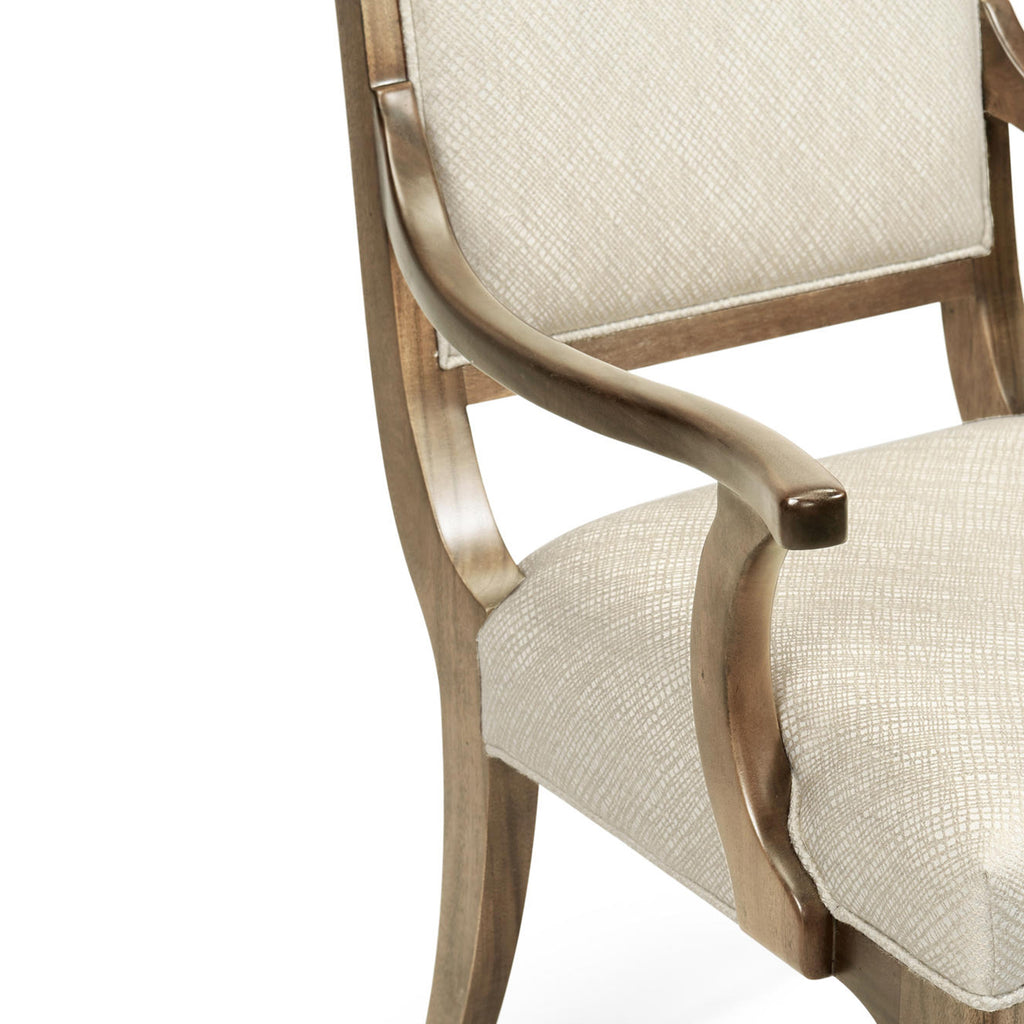 Sculpted from hardwood under a light transparent lacquer finish. This chair is upholstered in a Jonathan Charles performance fabric. Upholstered in Skipper.