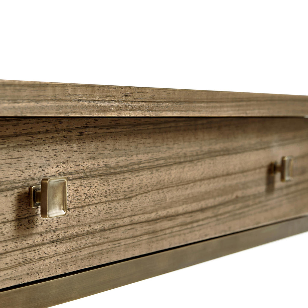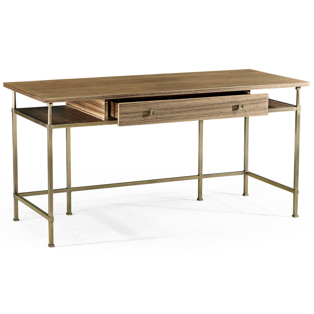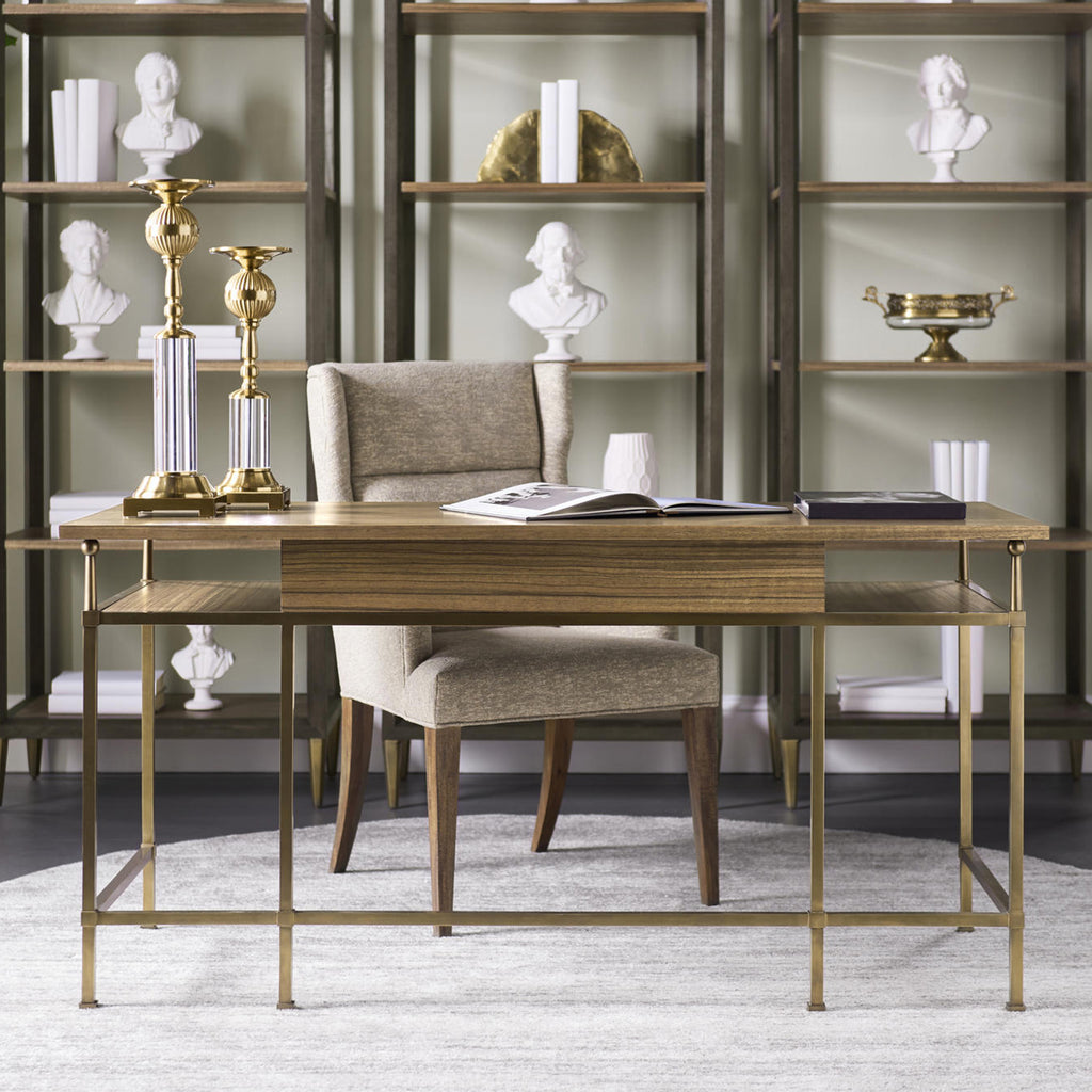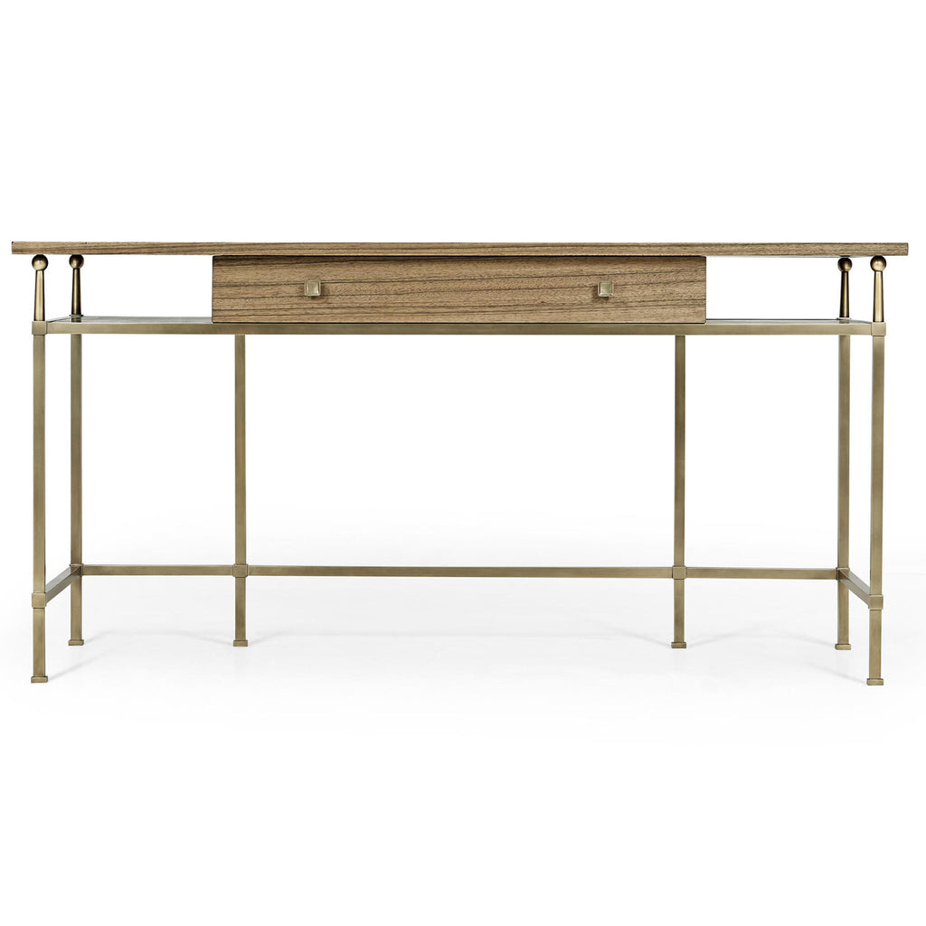 Top features flat cut paldao veneer with a light, transparent, lacquer finish. Legs and rails are fabricated from brass with an acid dipped, hand rubbed patina. Desk includes one drawer and two shelves.