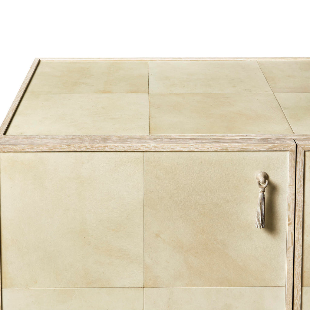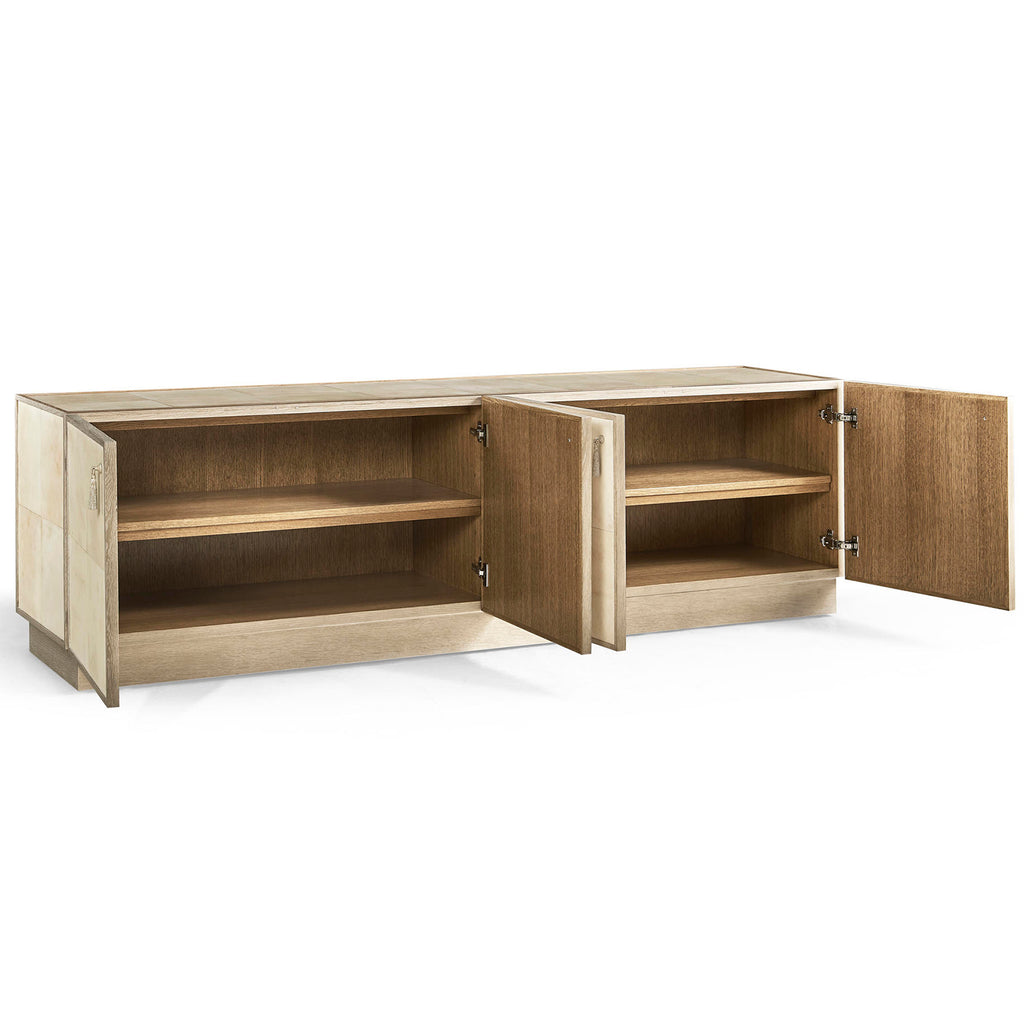 • Material: Oak Solids, Parchment, Flat-Cut Random Match Oak Veneers, Glass, Brass