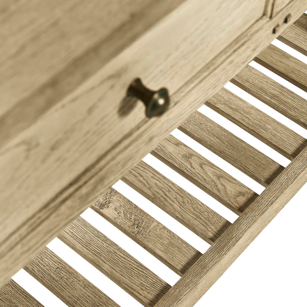 As transporting and beautifully crafted as it is useful, the Inclination Rustic French Console by Jonathan Charles is a fresh and inviting piece. Hand-built from Solid Oak with Chestnut Veneers bleached and lightly wire-brushed to accentuate exquisite wood grain patterns, Inclination evokes the ethereal old-world charm of the French countryside and rustic living.