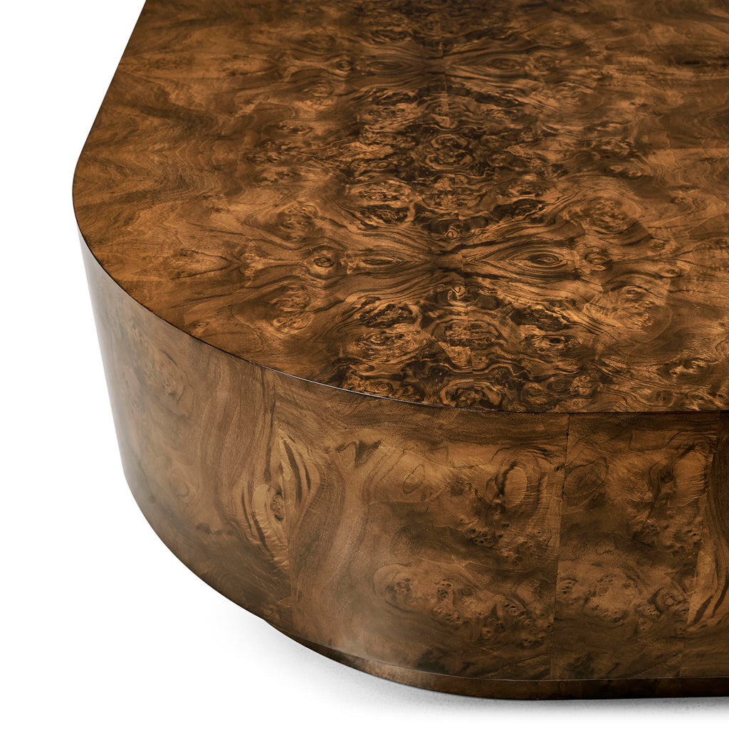 Blending classic elegance and contemporary sensibilities, the Jonathan Charles Jacques Cocktail Table enriches your surroundings. Crafted from book-matched walnut burl veneer, this table showcases the captivating beauty of natural wood patterns. The finish highlights the depth and richness of the wood's tones, creating an inviting and luxurious centerpiece for your space. Its rectangular silhouette features a rounded radius end in one corner, adding a touch of contemporary flair to the traditional silhouette. This subtle detail not only enhances the table's aesthetics but also creates visual interest and a unique focal point.