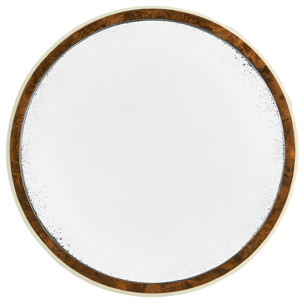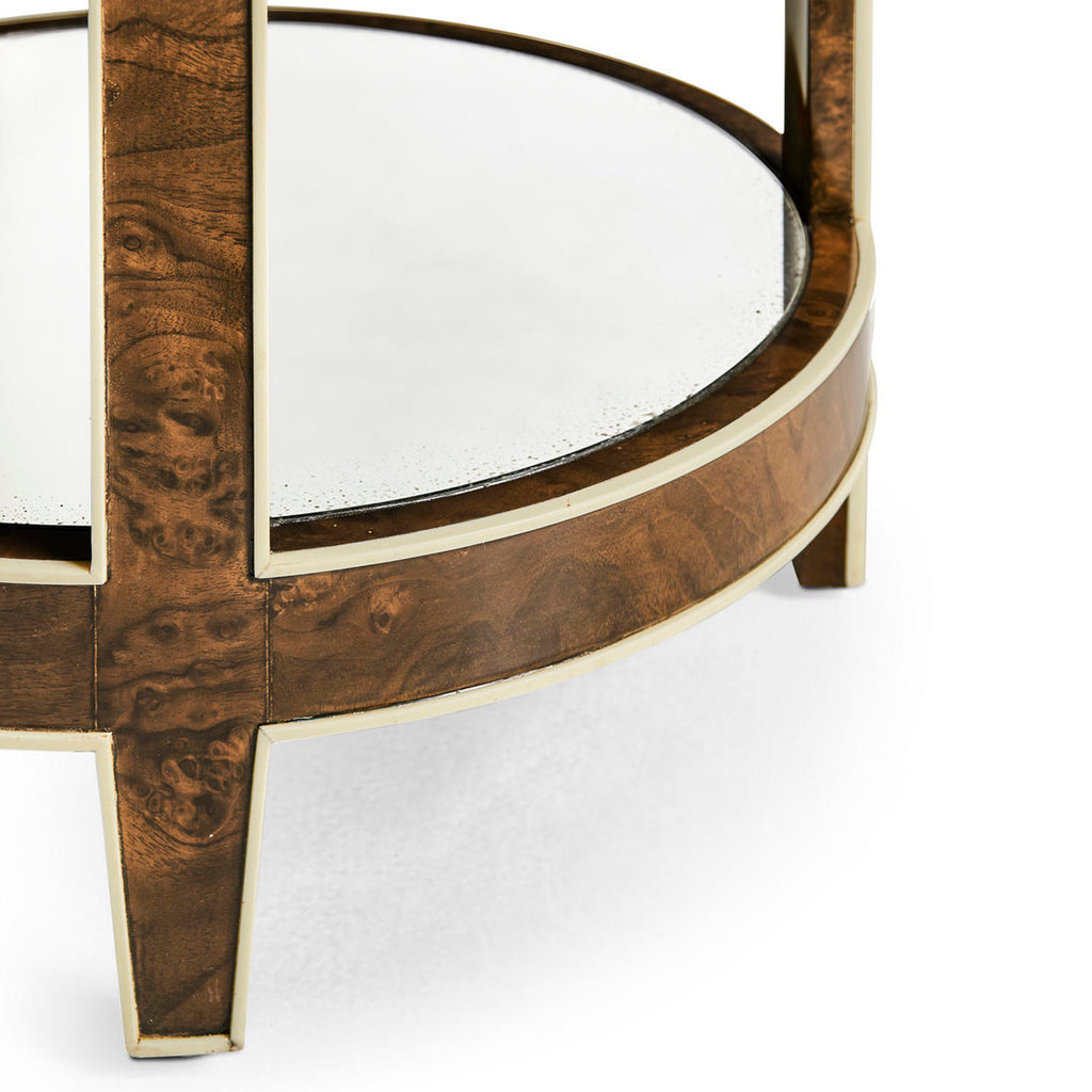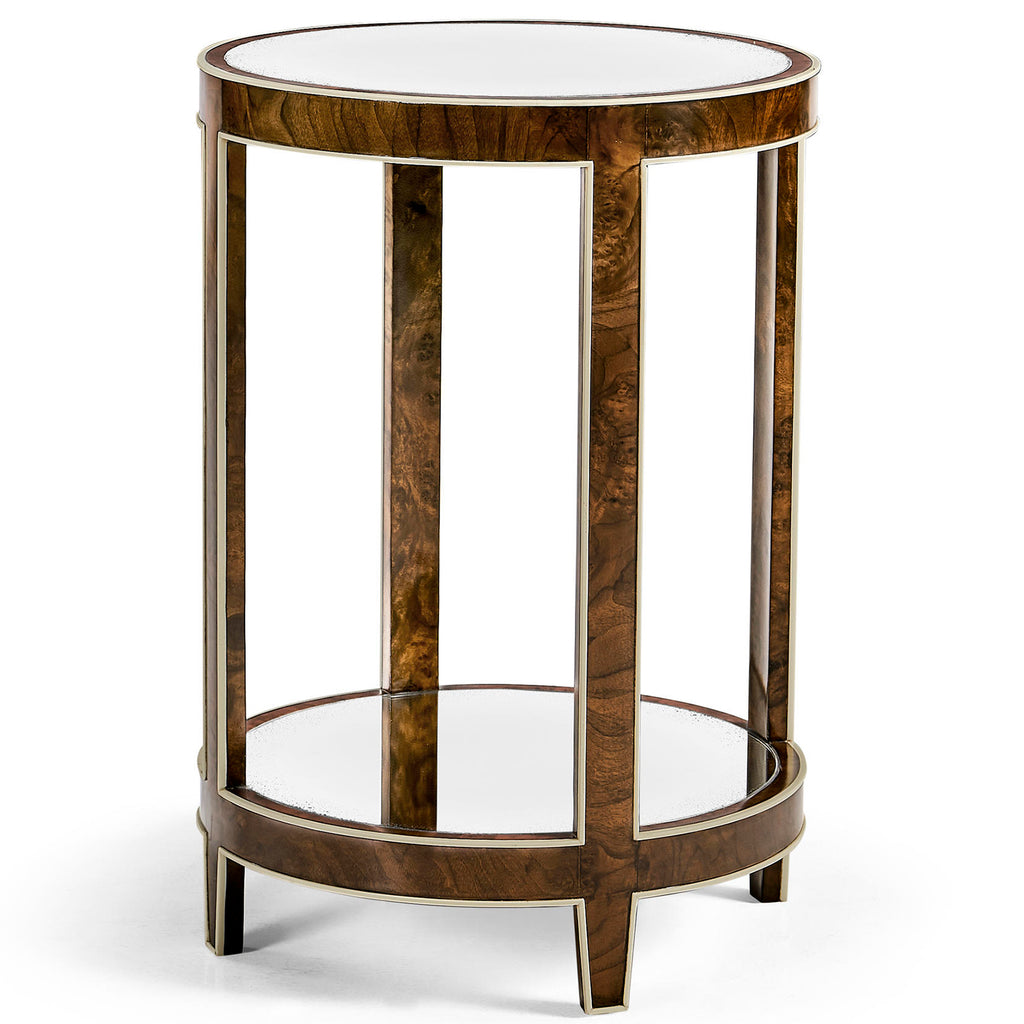 Enrich your surroundings with the Jonathan Charles Jacques End Table. Crafted from mahogany veneers, this side table boasts a rich and captivating appearance that exudes warmth and natural beauty. The medium brown mahogany finish highlights the wood's grain, creating a piece that resonates with classic sophistication. The antique mirrored top and shelf infuse a sense of vintage glamour and feature faux bone inlay, adding a touch of elegance and contrast to the table. The line is repeated down the delicate legs to the tapered feet, adding beautiful contrast to this classic silhouette.