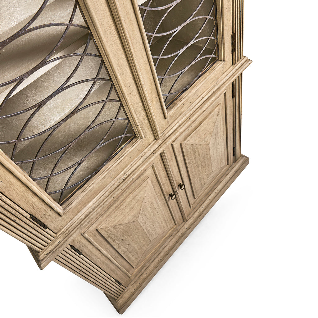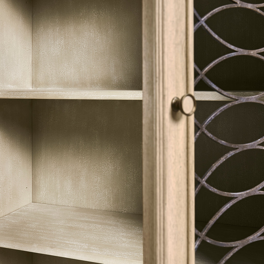 The Kairos Display Cabinet combines classic elegance with modern functionality. Finished in a warm Bleached Walnut, this stunning piece is designed to showcase your favorite items while adding a sophisticated touch to the home. The cabinet features adjustable shelves behind the doors, which are adorned with intricate metalwork finished in rustic iron, creating a beautiful, eye-catching pattern. This metal detailing adds an industrial edge that contrasts beautifully with the natural wood tones. With its blend of refined craftsmanship and practical storage, the Kairos Display Cabinet is perfect for highlighting your decor.