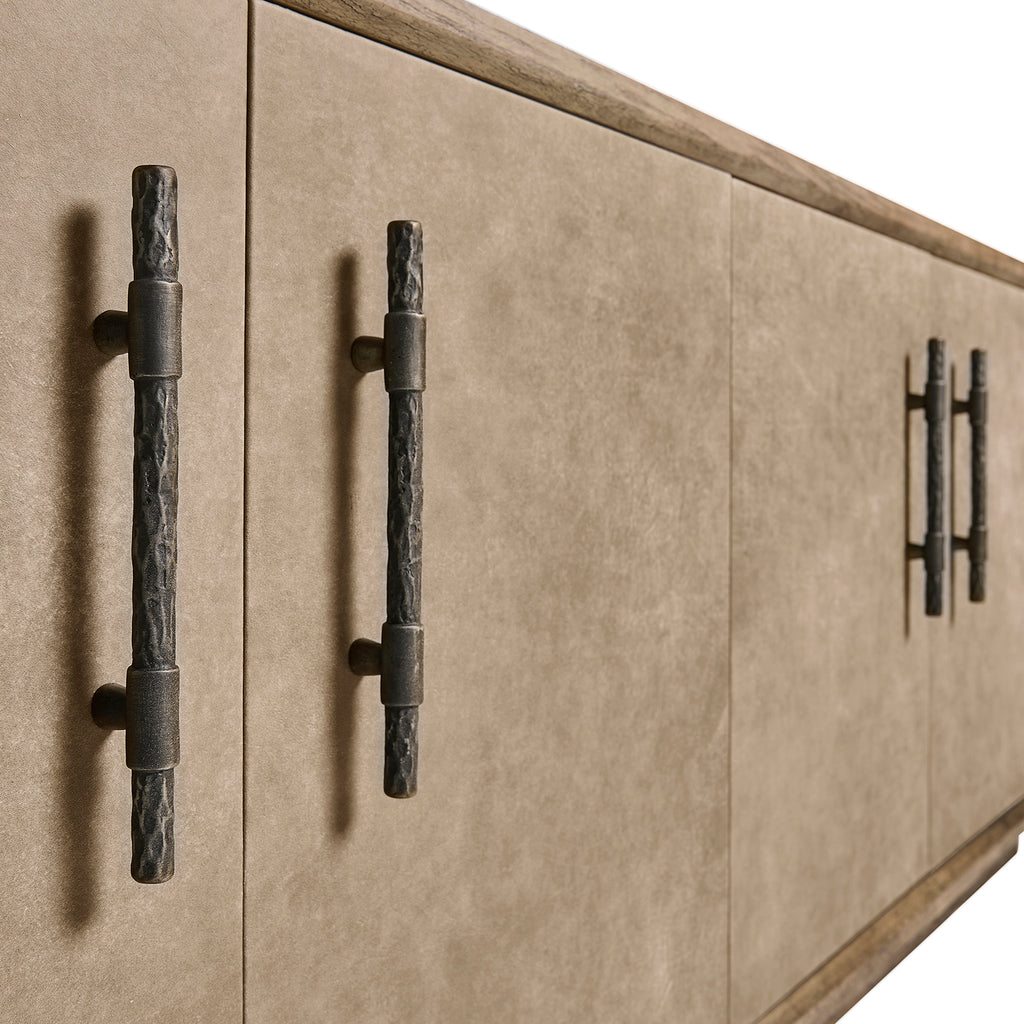 The Stone Ridge Leather Credenza is a stunning blend of modern design and organic materials, making it the perfect statement piece for your home. Finished in Tully Light Acacia, this credenza showcases four sleek doors adorned with elegant grey-brown toned leather fronts, offering a unique contrast that adds warmth and texture to the overall design. Behind the doors, adjustable shelves provide flexible storage options, making it as practical as it is beautiful. The modern silhouette, combined with natural materials, gives this piece versatility—whether you're complementing a rustic-inspired home or adding a touch of nature to a contemporary setting.