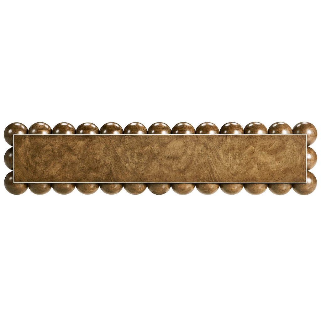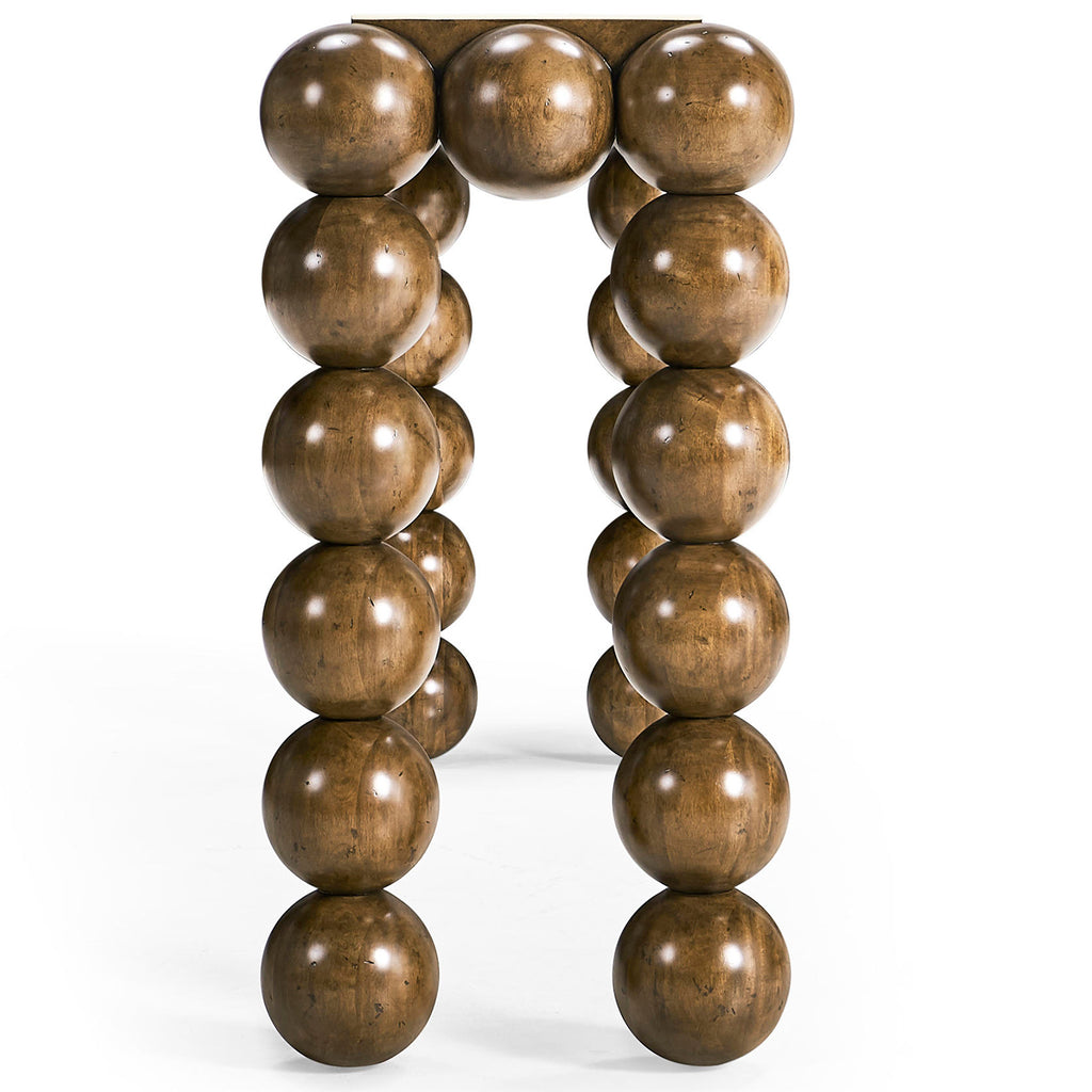Elevate your home with the perfect imaginative design and contemporary aesthetics through the Jonathan Charles Orb Console Table. With its captivating spheres and luxurious finish, it becomes the centerpiece that seamlessly combines modern elegance and sophistication. The table's solid wood stacked orbs form a charismatic foundation that fuses art and functionality. These orbs create a unique and eye-catching leg and apron design that add personality to the piece. The faux bone inlay creates a subtle visual contrast against the medium brown mahogany veneers, elevating the table's overall appearance. Immerse yourself in the playful side of modern design.
