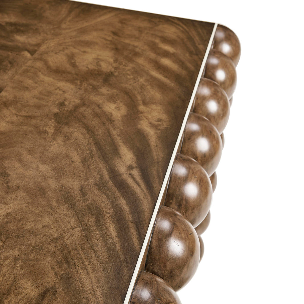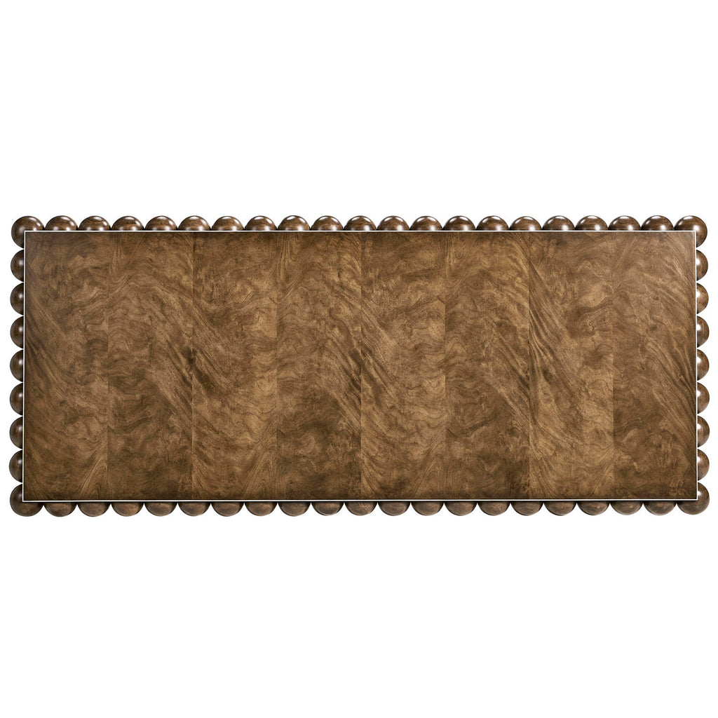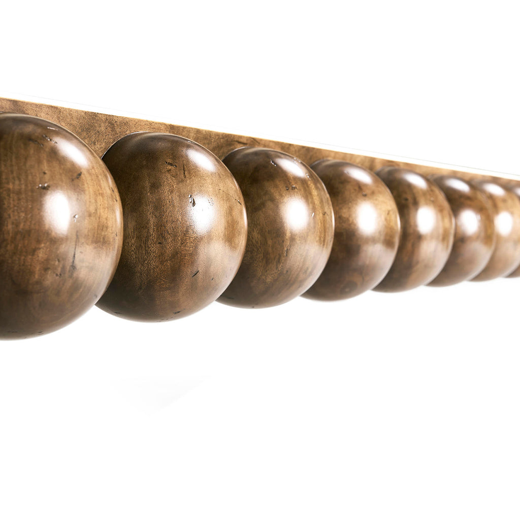 Elevate your dining experience with the perfect imaginative design and contemporary aesthetics through the Orb Dining Table. With its captivating spheres and luxurious finish, it becomes the centerpiece that seamlessly combines modern elegance and sophistication. The table's solid wood stacked orbs form a captivating foundation that fuses art and functionality. These orbs create a unique and eye-catching leg and apron design that add personality to the piece. The faux bone inlay creates a subtle visual contrast against the medium brown mahogany veneers, elevating the table's overall appearance. Immerse yourself in the playful side of modern design and transform every meal into an experience.
