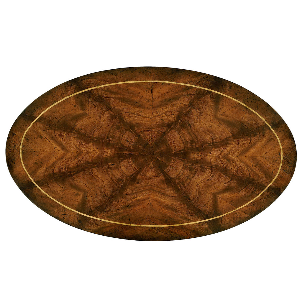 Classically styled oval mahogany side table using the finest crotch veneers and standing on tapering legs. Contrasting light stringing inlay throughout.
