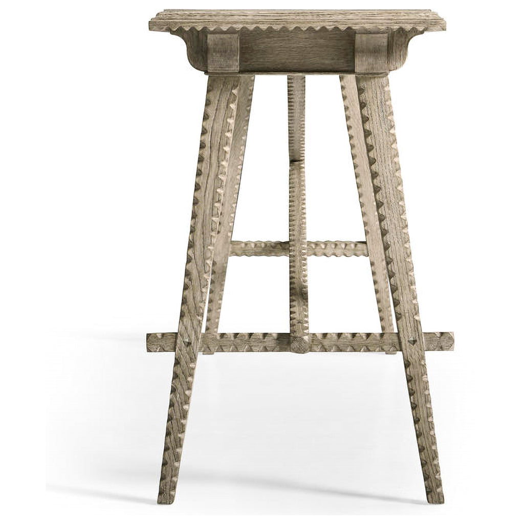 The Stratford Console Table blends casual elegance with intricate craftsmanship. Featuring tramp-style carvings that add a touch of artisanal detail, this table features a greyed oak finish for a relaxed, airy feel. Its light, versatile design complements a variety of interiors, making it the perfect addition for living spaces seeking a balance of style and subtle sophistication.