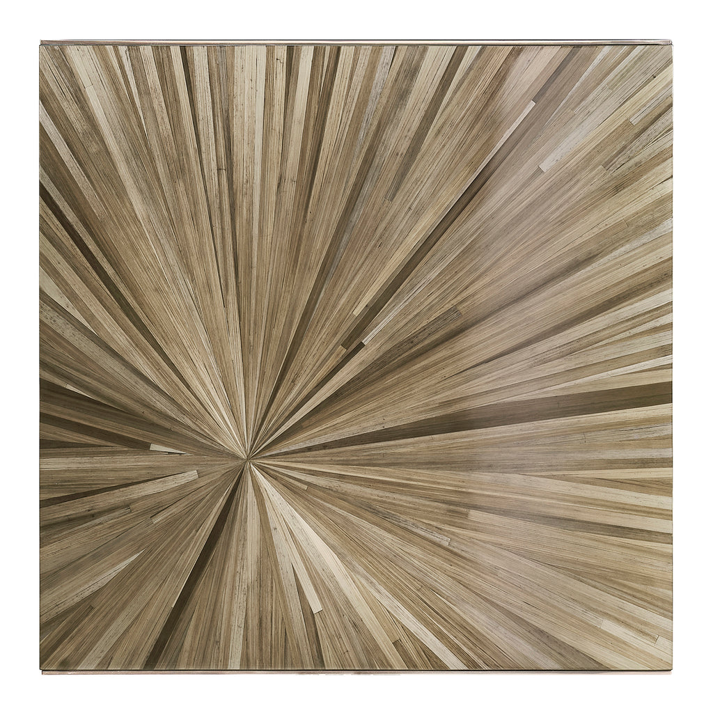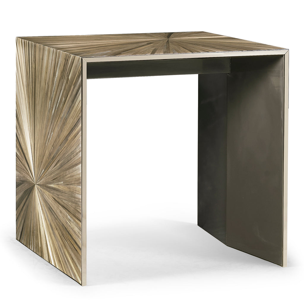 The Terra Waterfall End Table is a beautiful example of expert craftsmanship and modern design. Its surface is adorned with intricate straw marquetry in natural brown tones, hand-applied to create a captivating pattern that is brought to life by a high-gloss finish. The table's base features lacquered black on the inside of the legs, offering a subtle contrast that adds depth and dimension to the piece. The Terra Waterfall End Table maintains a sleek, minimalist profile while serving as a striking accent in the home.