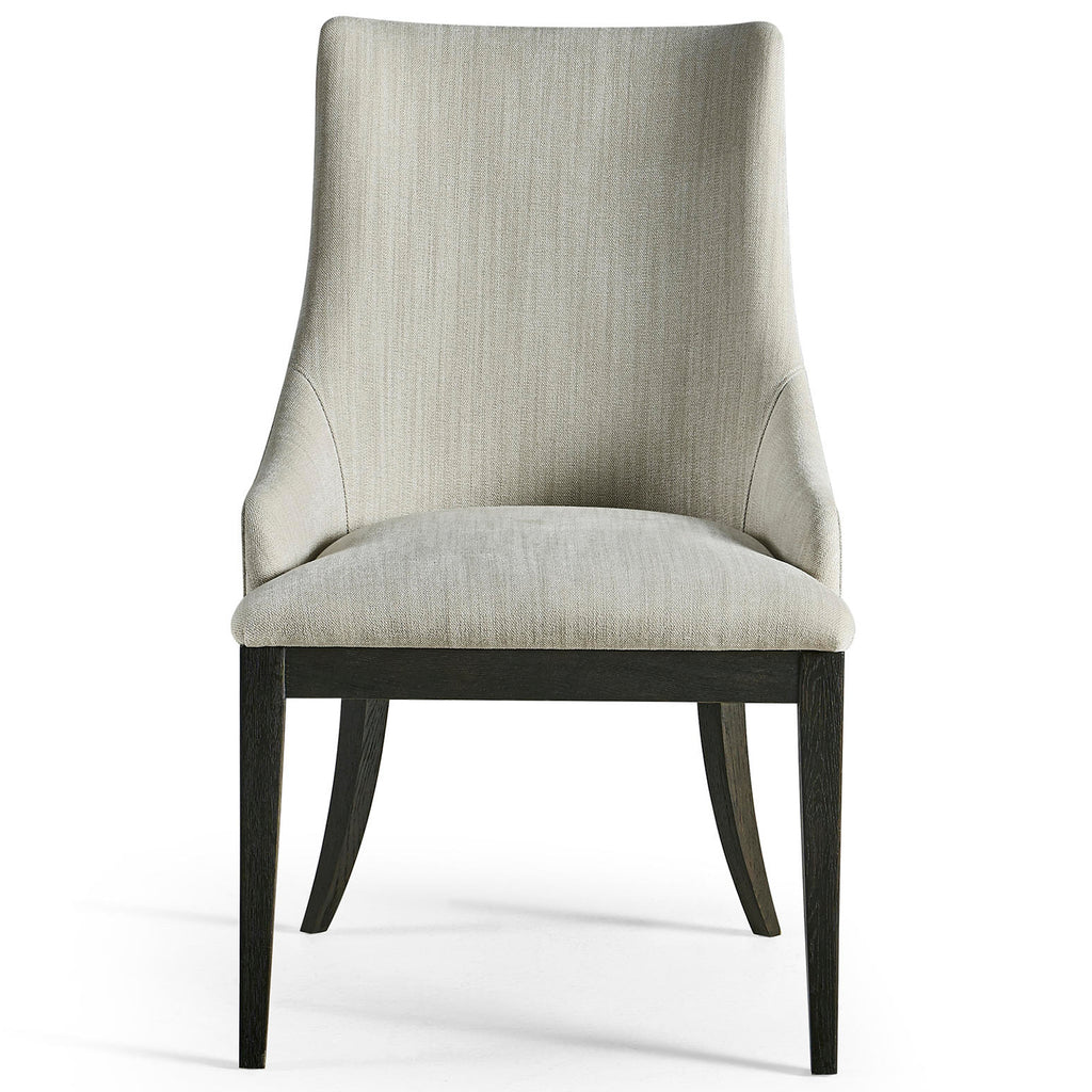 The Jonathan Charles Aurora Upholstered Side Chair by Jonathan Charles is perfectly proportioned, exuding timeless elegance and modern sofistication. With a gently sloping back fully upholstered in pristine performance fabric, Aurora is a vision in creamy oatmeal and white, offering unparalleled refinement. A lightly worn Ebonized Black wood finish imbues a hint of rustic charm that brilliantly contrasts the elegant structural frame and soft organic forms for dining chair that accentuates transitional and contemporary spaces.