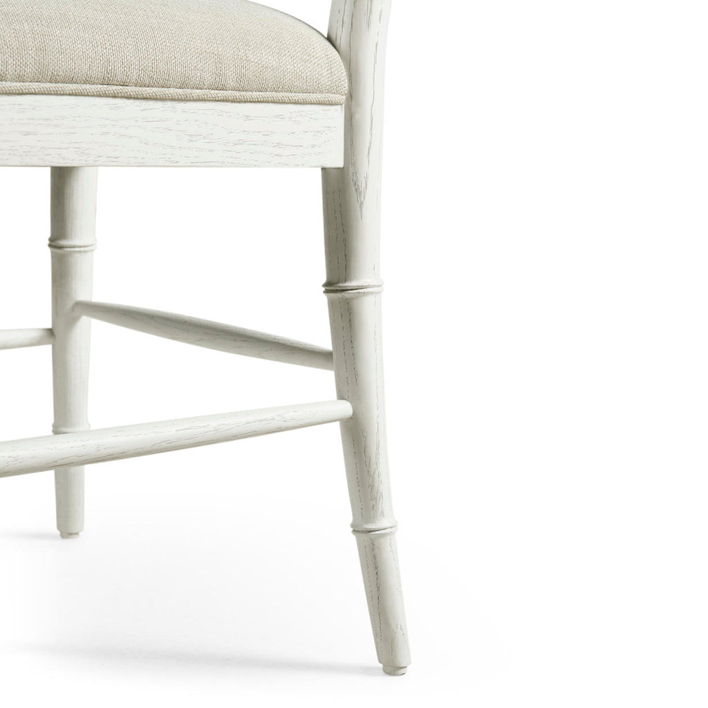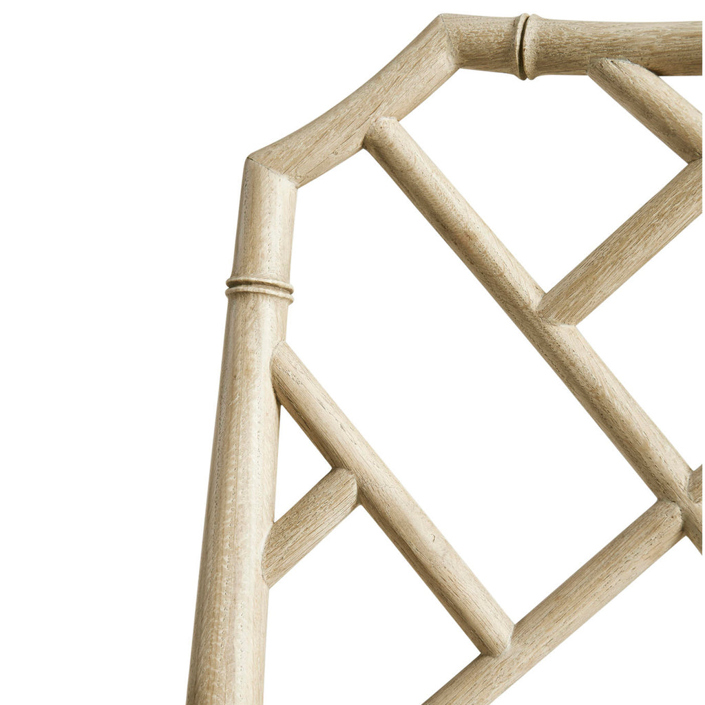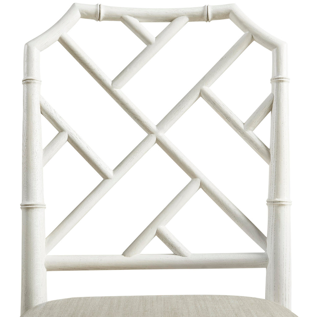 Created by the masterful Jonathan Charles craftsmen and women, the Saros Chippendale Bamboo Side Chair is a fresh and zany take on timeless design. A geometric design lattice back formed out of bamboo is finished in deliciously dry Stripped Oak with light distressing to create a masterful showstopper. Upholstered in earthy oatmeal performance fabric, the Saros chair adds comfort and intrigue to refined dining spaces.