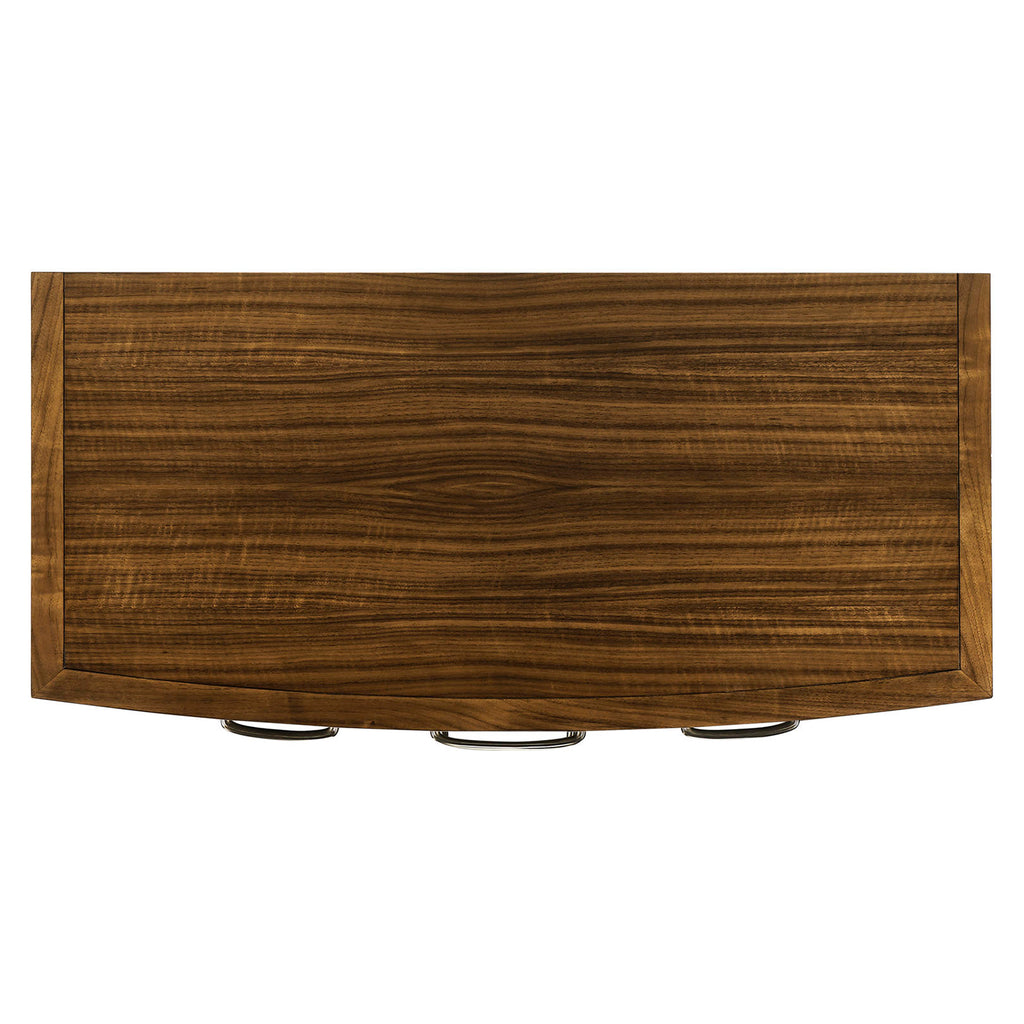 This cabinet is constructed of American walnut with a transparent, lacquer finish. Drawer fronts feature walnut veneers in a box match pattern. Hardware is cast from brass, acid dipped and hand rubbed to achieve a rich, natural patina. Sides of cabinet display face grade veneer.