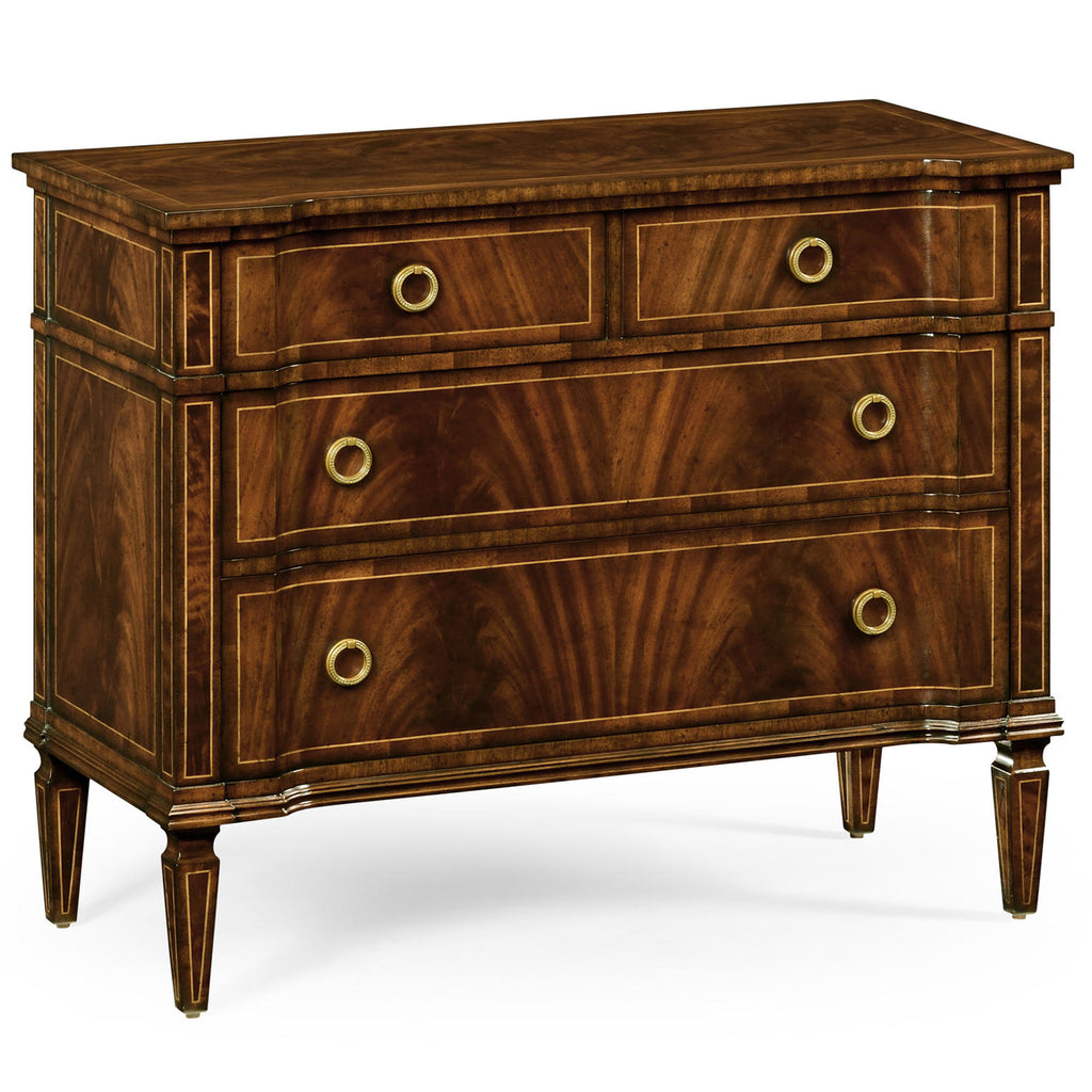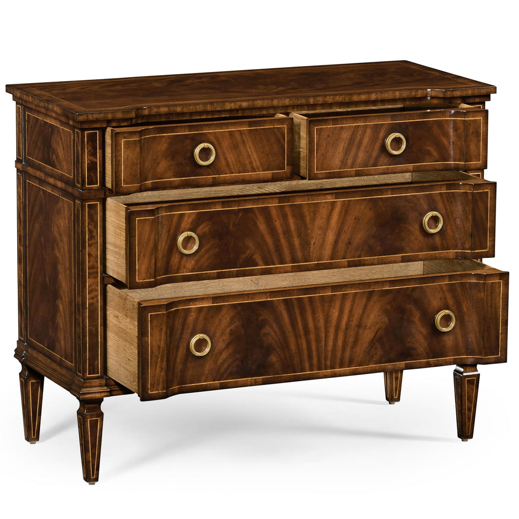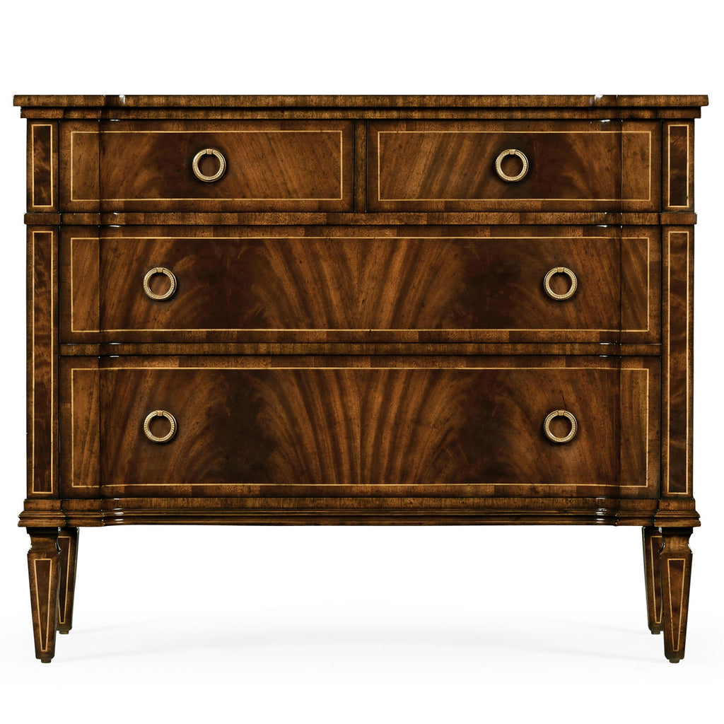 Regency style reverse breakfront chest of four drawers. Two small drawers above two graduated larger drawers. Contrasting stringing throughout and raised on square cross-section feet.