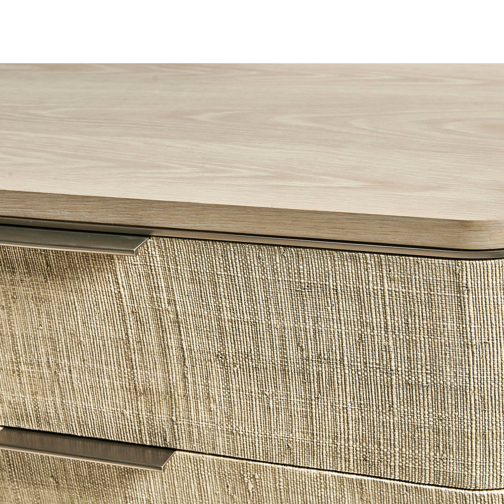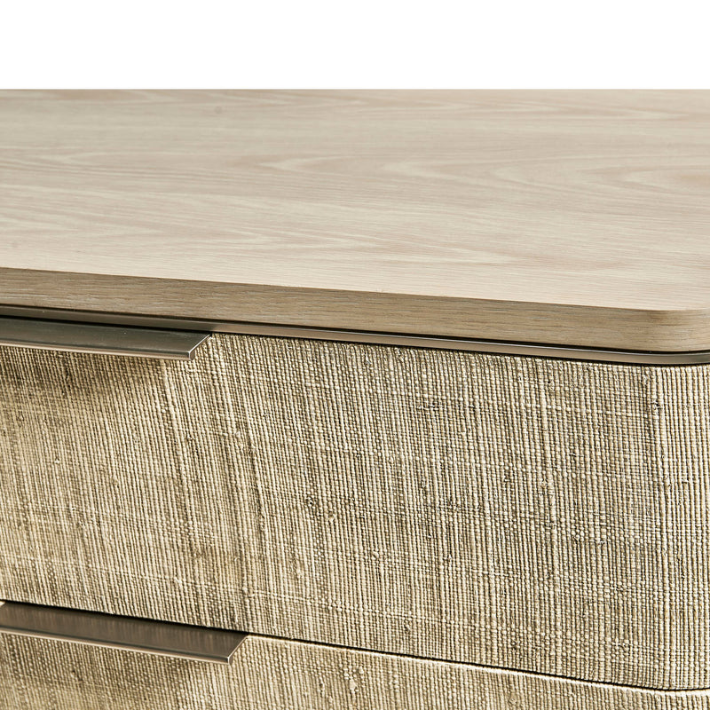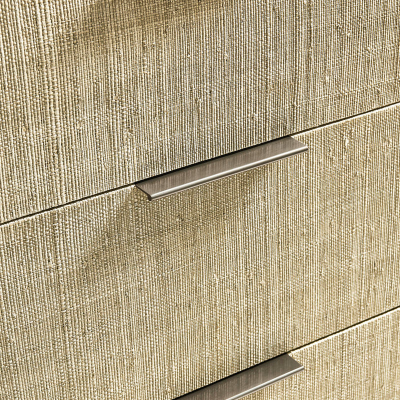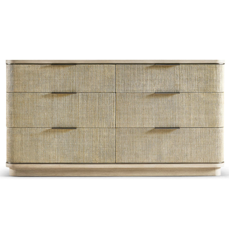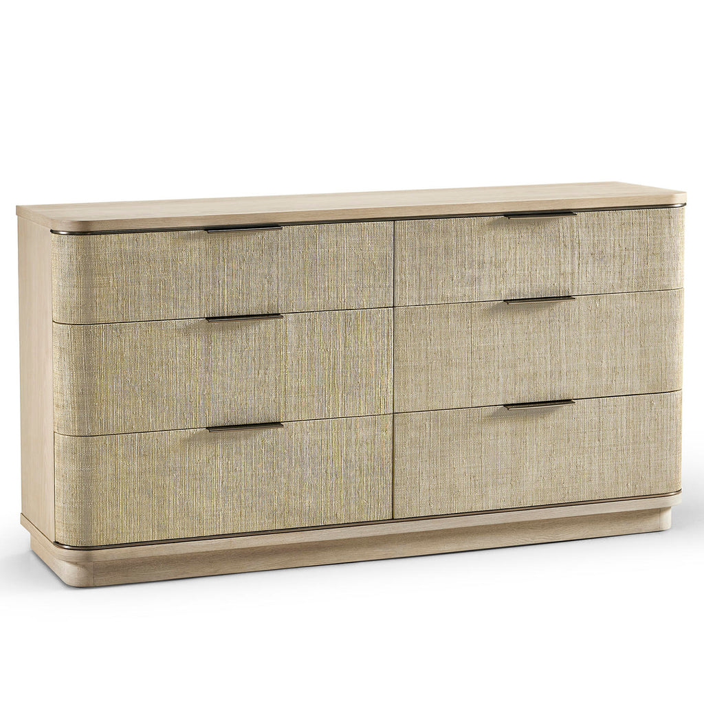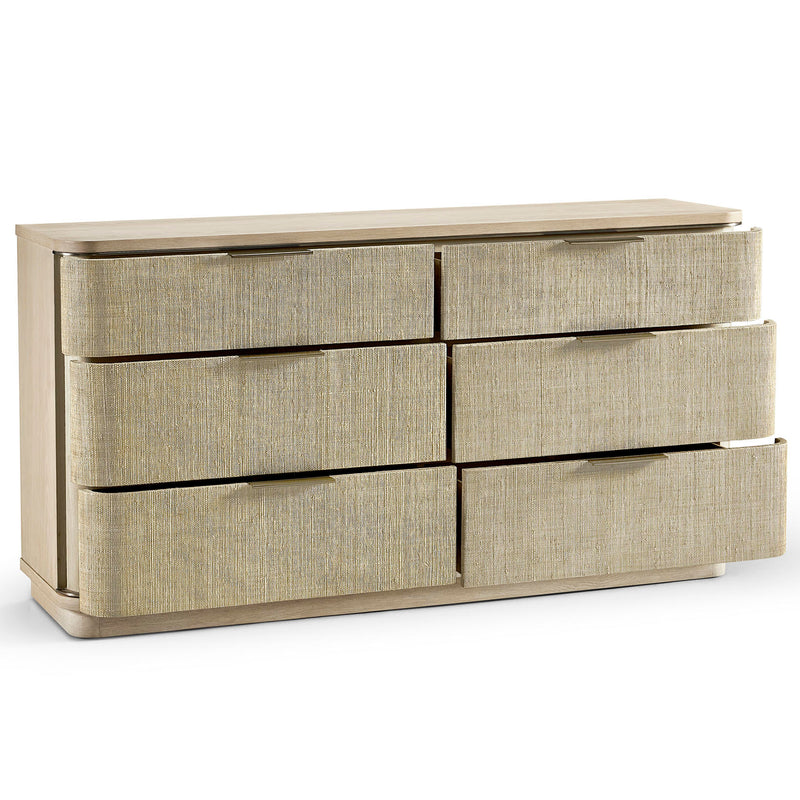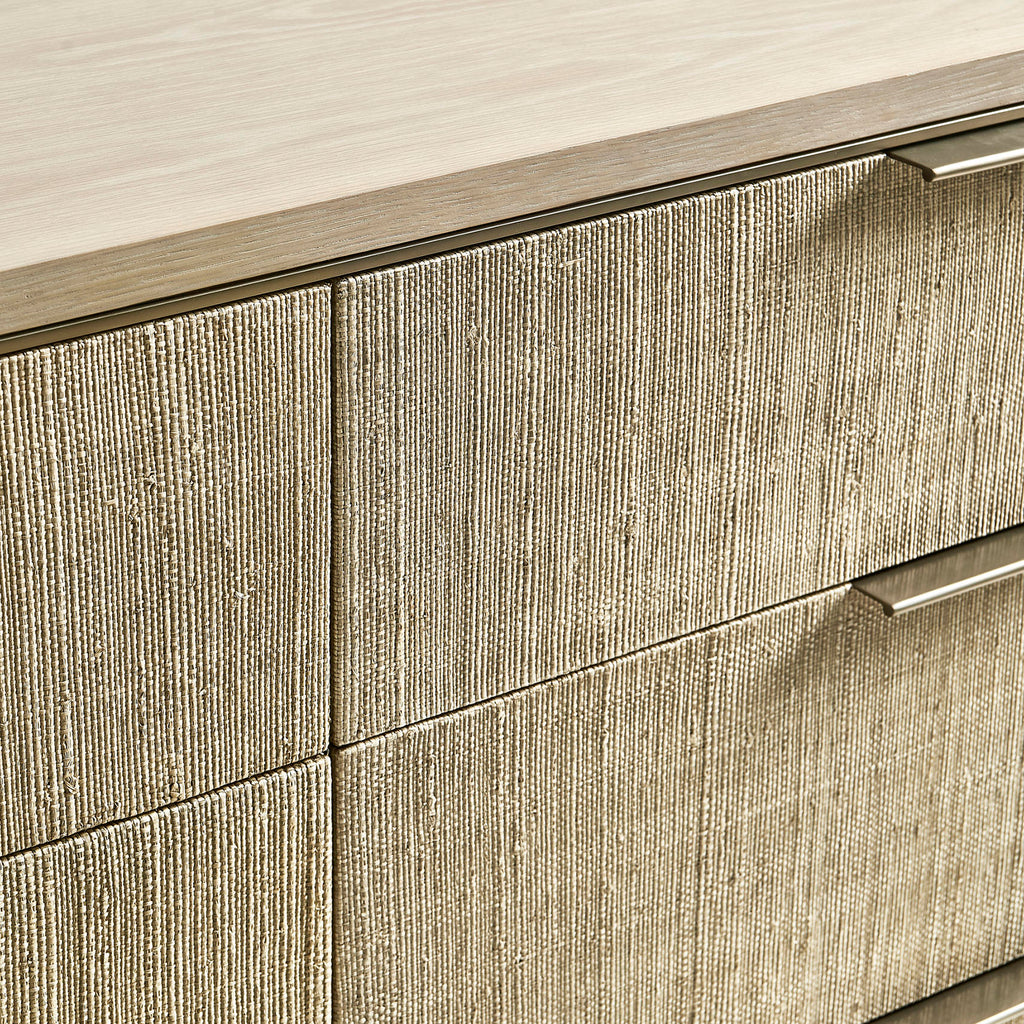Born from passion with incredibly crafted aesthetic details, the Jonathan Charles Seiche Woven Wave Double Dresser’s captivating lines and sublime curves promise a new level of interior expression. Handwoven Grasscloth wraped around six Bleached Oak drawers with custom cast hardware in an eclectic mix of materials that captures a dazzling sense of organic movement and form.