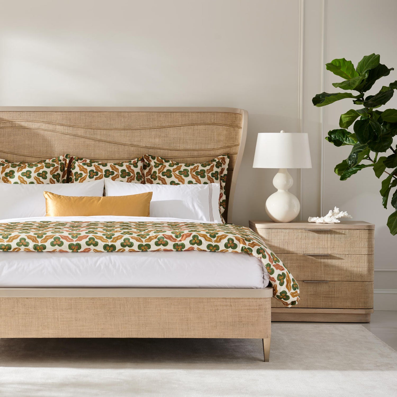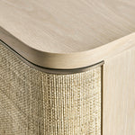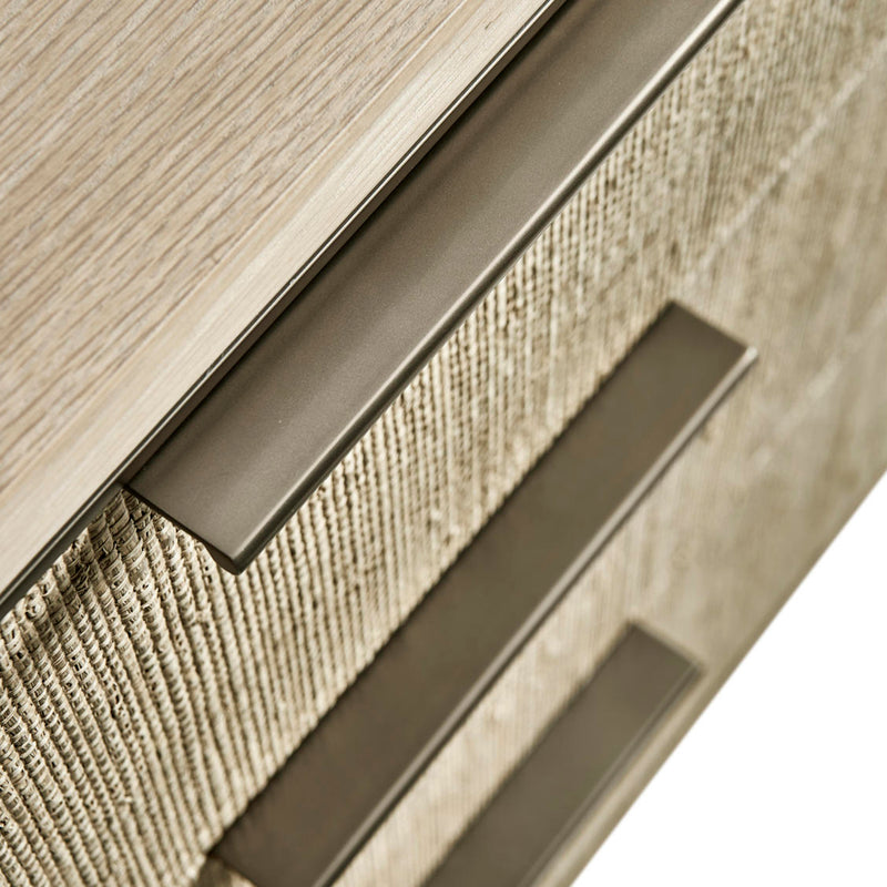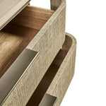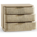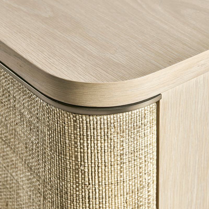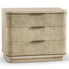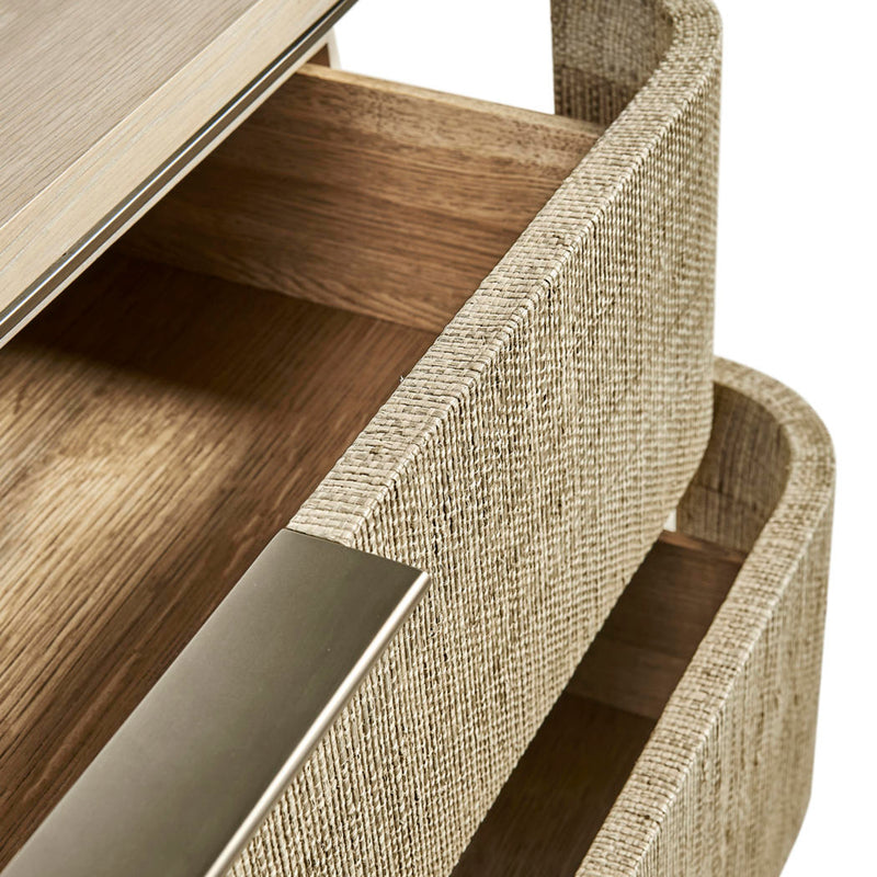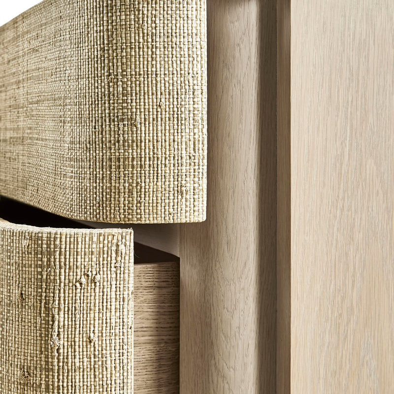 Born from passion with incredibly crafted aesthetic details, the Jonathan Charles Seiche Woven Wave Night Chest’s captivating lines and sublime curves promise a new level of interior expression. Grasscloth wrapped around three Bleached Oak drawers with custom cast hardware in an eclectic mix of materials that captures a dazzling sense of organic movement and form.