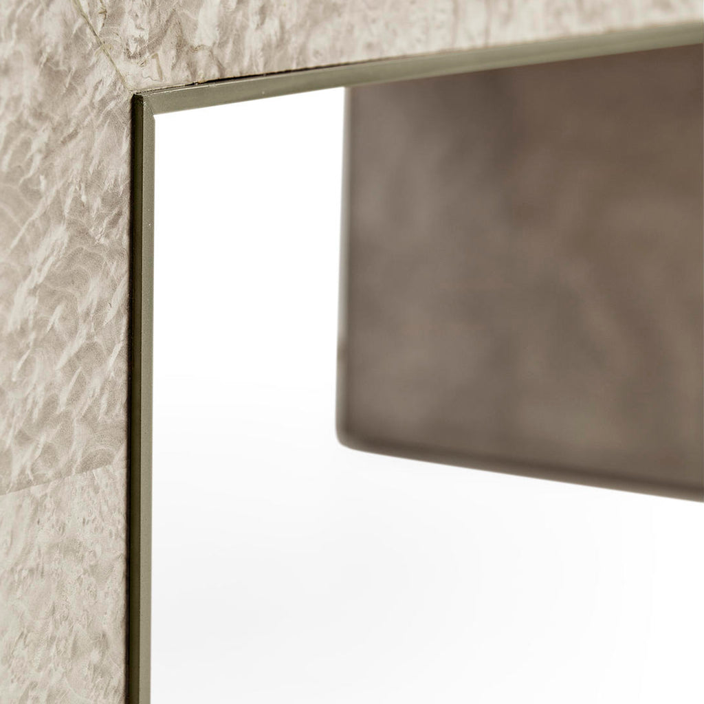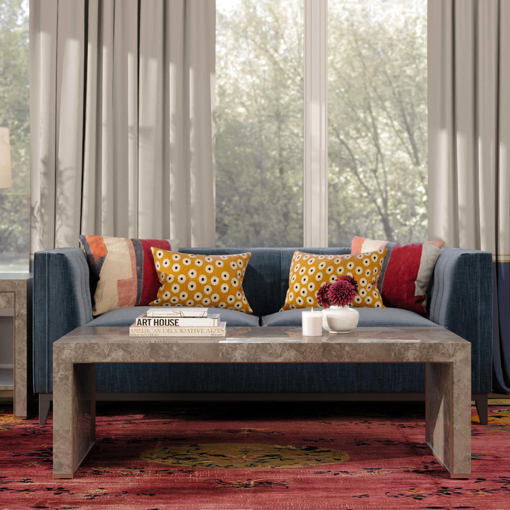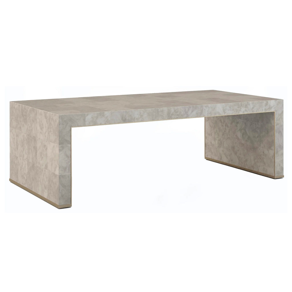 A showstopper of Jonathan Charles’ Water portfolio, the Surge Cocktail Table stands apart from a world of standardized choices. Inspirational design elements lead with a butcher block top and sides honed from mesmerizing Madrona Burl slabs finished in Smoke Gray. Understated metal accents along the base and ridges are finished in Satin White Brass for a delightful contrast and shimmering lightness. With an alluring surface and strong forms, Surge is sure to captivate audiences in contemporary interiors.