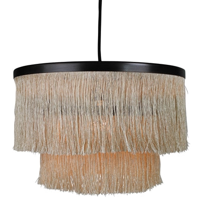A bronze frame drips with tiers of fringe in a warm blush hue giving your room a lively - yet tranquil - lighting feature. 5ft cloth-wrapped cord with canopy, plug in style is convertible to hard-wiring. Light bulb not included.