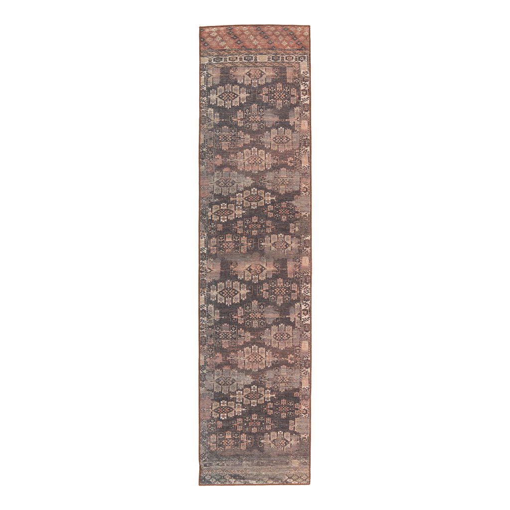 Inspired by well-traveled vintage designs, Kate Lester has joined with Jaipur Living to launch the Harman collection. This impressive assortment of antique textile designs lends heirloom-quality looks and livable style to any space. The Minerva area rug showcases a Southwestern trellis pattern emphasized by hues of dark brown, beige, terracotta, plum, and orange. This digitally printed rug boasts a perfectly distressed effect for effortless charm that is matched with durability to stand up to heavily trafficked spaces such as entryways, halls, kitchens, and living rooms.