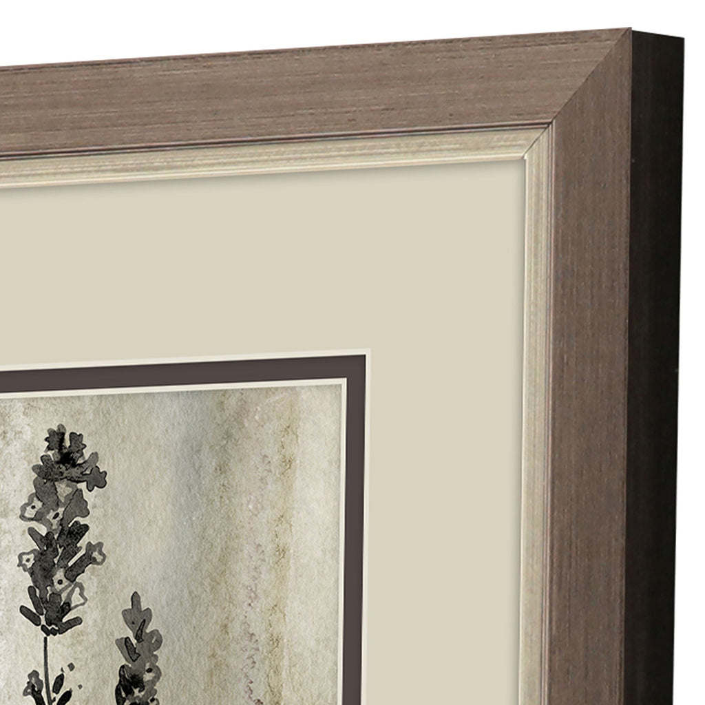 Flower silhouettes on a mottled background are matted in putty. Framed in a brushed pewter finish moulding with silver lip.