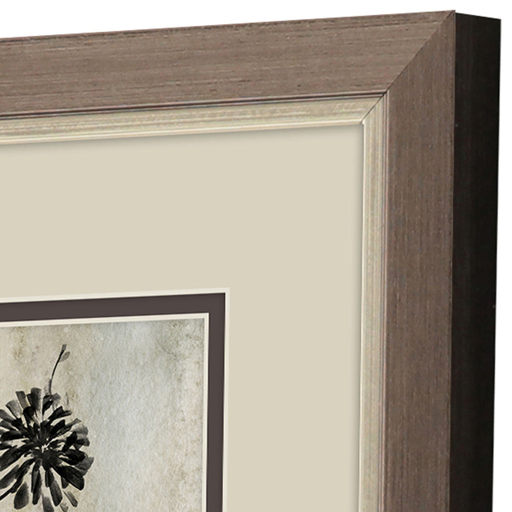 Flower silhouettes on a mottled background are matted in putty. Framed in a brushed pewter finish moulding with silver lip.