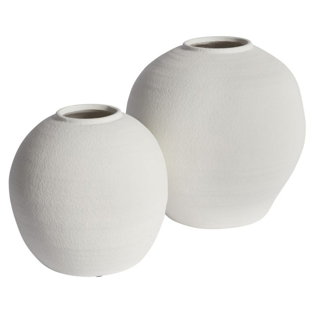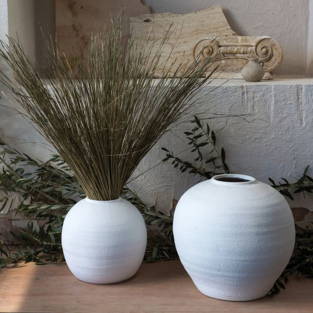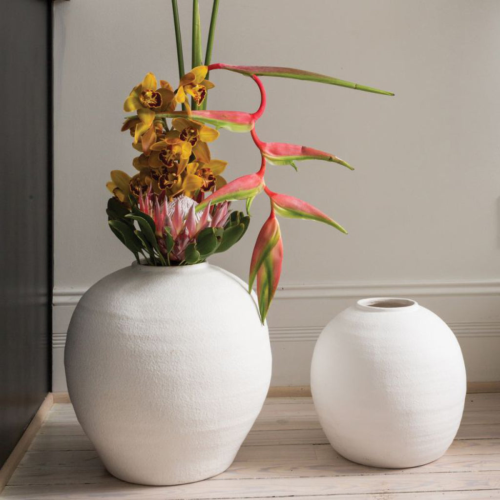 The Konos Vase is a round bellied cement vase in bright textural white. Its size and shape provide a perfect canvas for a large statement arrangement or a simple tropical stem.