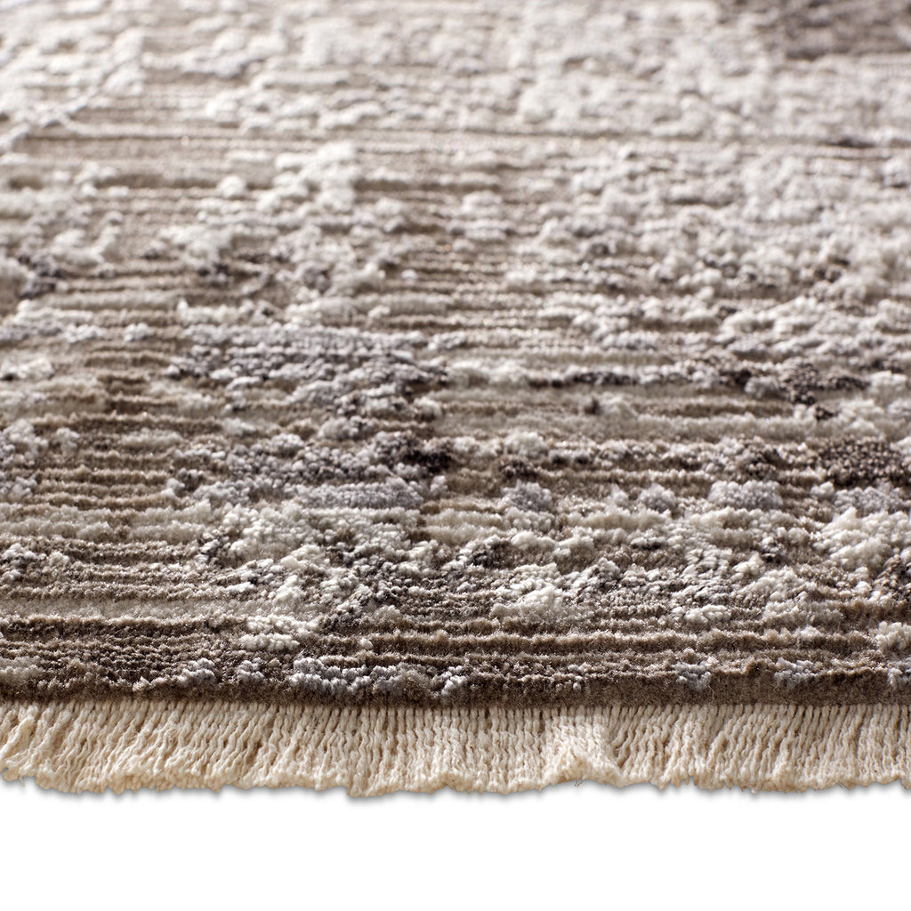 The stunning En Blanc collection captures the elegance of neutral, vintage-inspired patterns and melds Old World aesthetics with an updated and luxurious vibe. The Ginevra rug boasts a subtly distressed center medallion motif in tonal hues of silver, cool gray, golden tan, and light taupe. Soft and lustrous, this chameleon-like design emulates the timeless style of a Turkish hand-knotted rug, but in an accessible polyester and viscose power-loomed quality.