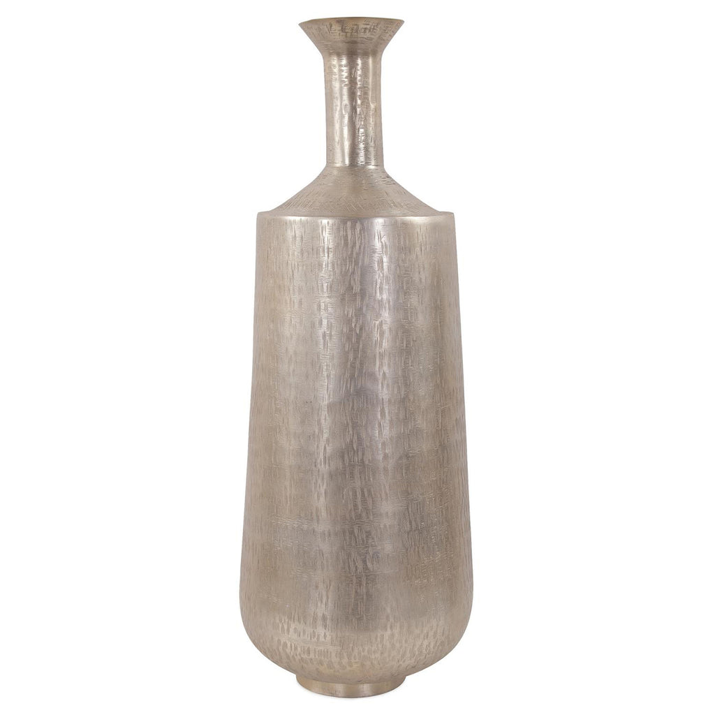 Beautifully forged and crafted by hand, the intricate etched crossway pattern helps to bring each shape to life with added dimension and texture. The flared neck large vase in a lustrous champagne finish makes a great accent piece all alone or filled with a few artificial sprigs to lighten up a room.
