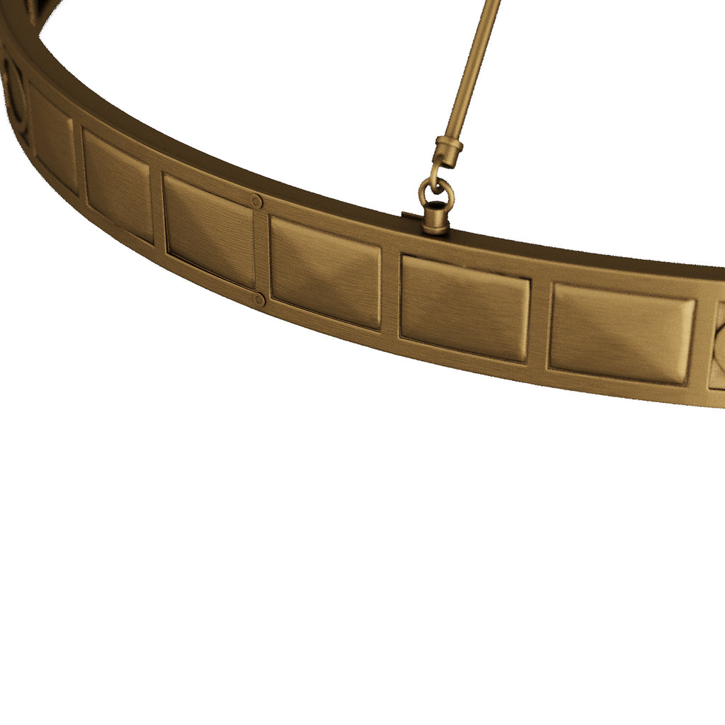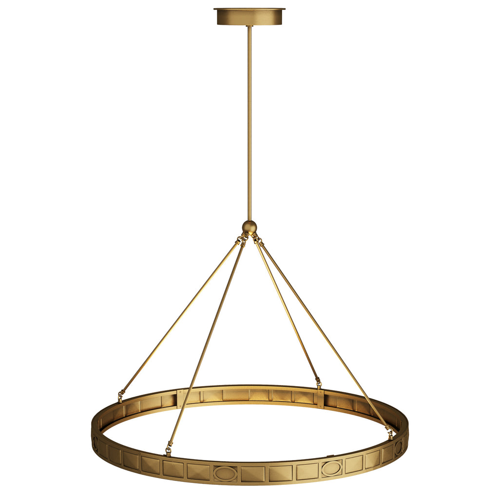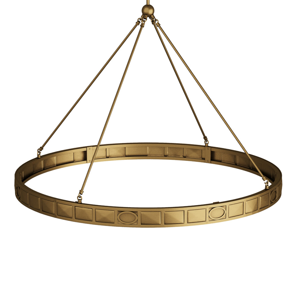 As part of the Arteriors Empire series of objects: this antique brass chandelier created of iron and glass uses the ideas of origami and geometry as a kind of mystical decorative language conjuring up both treasures of the past and the future. These are the jewelry of the collection, a precise and polished counterbalance to the more hand-hewn objects.