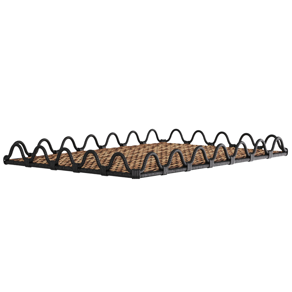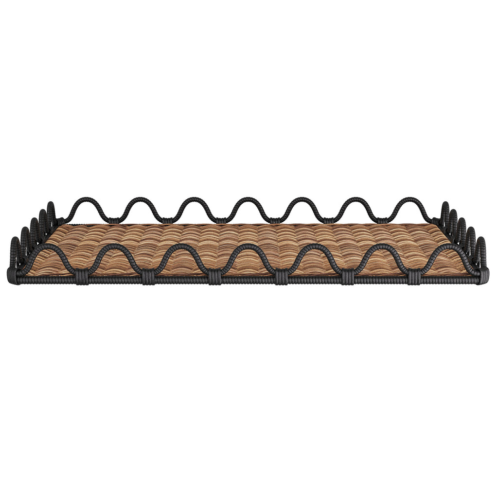 This Arteriors Mar Tray is a nod to a tropical still life painting. Here it’s easy to imagine flowers and fruit flowing from these handmade natural and black rattan vessels that have an urbane quality by the addition of a noir wrapping detail. In-fact, the ink-stained finish, like a class little black dress, finds its importance throughout the collection, allowing many pieces to hold both the place of formal and informal. Finish will vary.