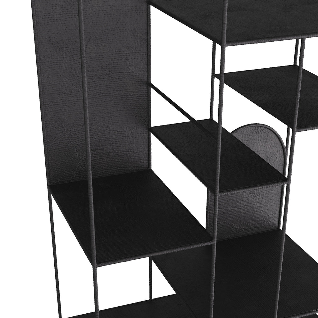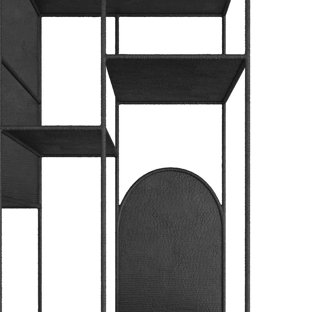 The Arteriors Mesón etagere is configured asymmetrically and rendered in natural hammered iron with ink-stained shelves. This etagere has dark back panels which beautifully frame any object and when used in pairs, is the perfect combination of elements to create architecture in a space where there is none.