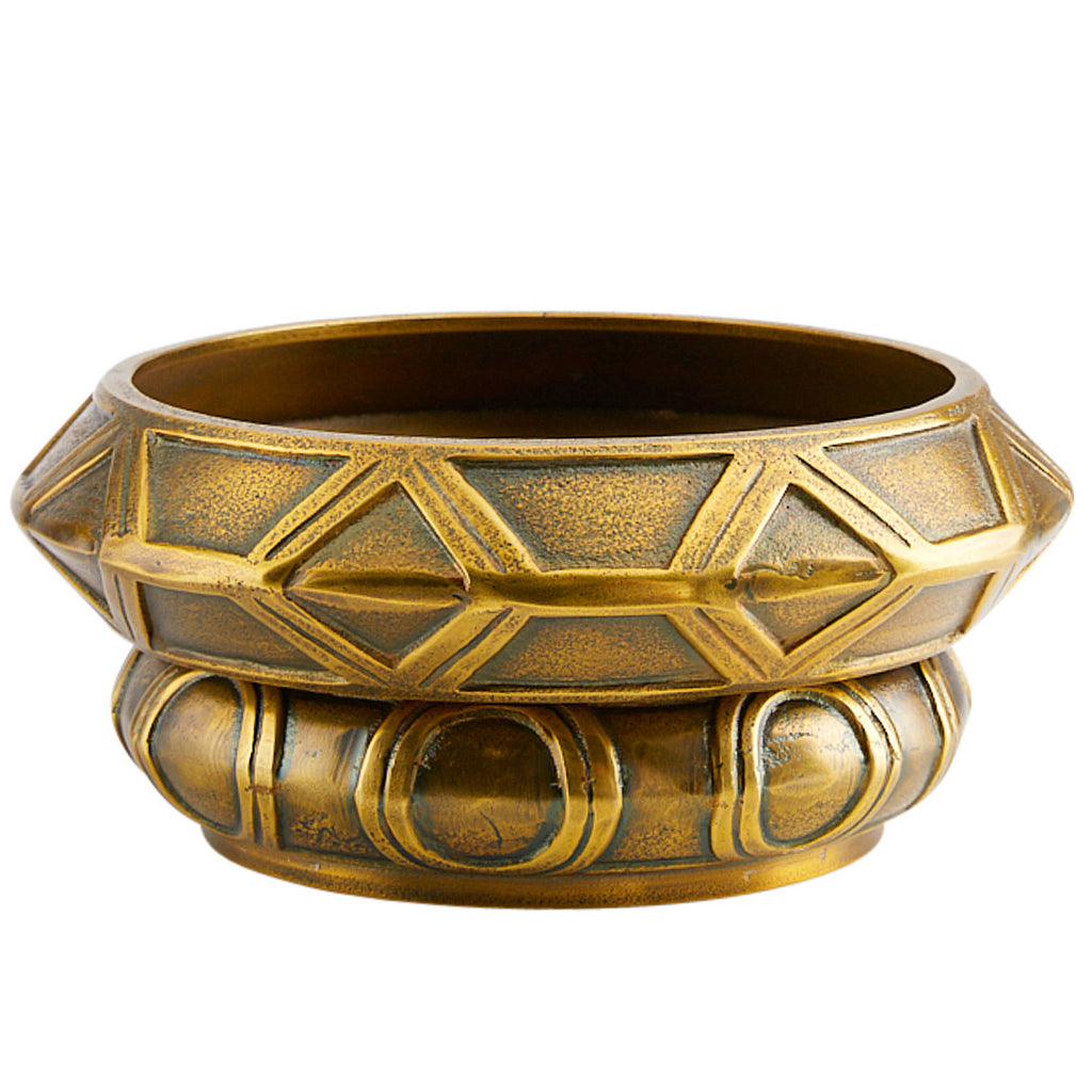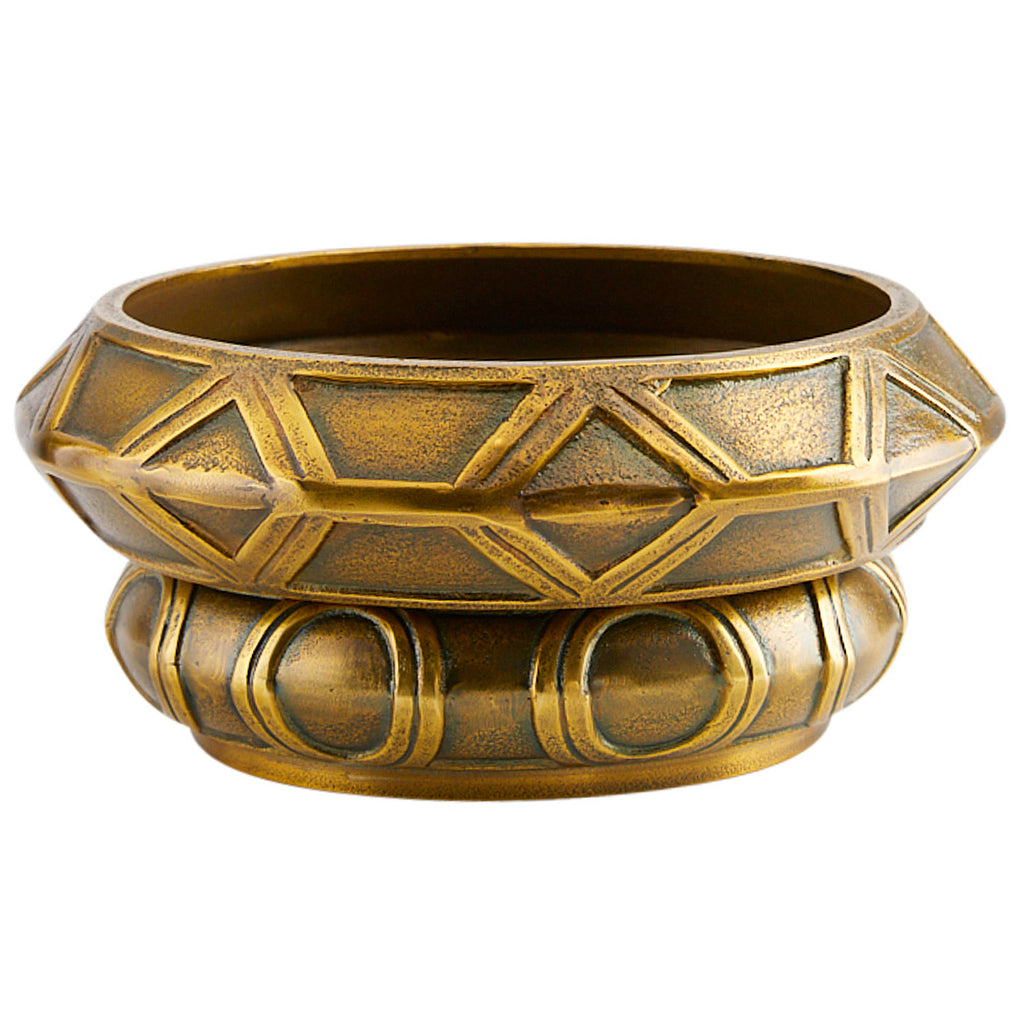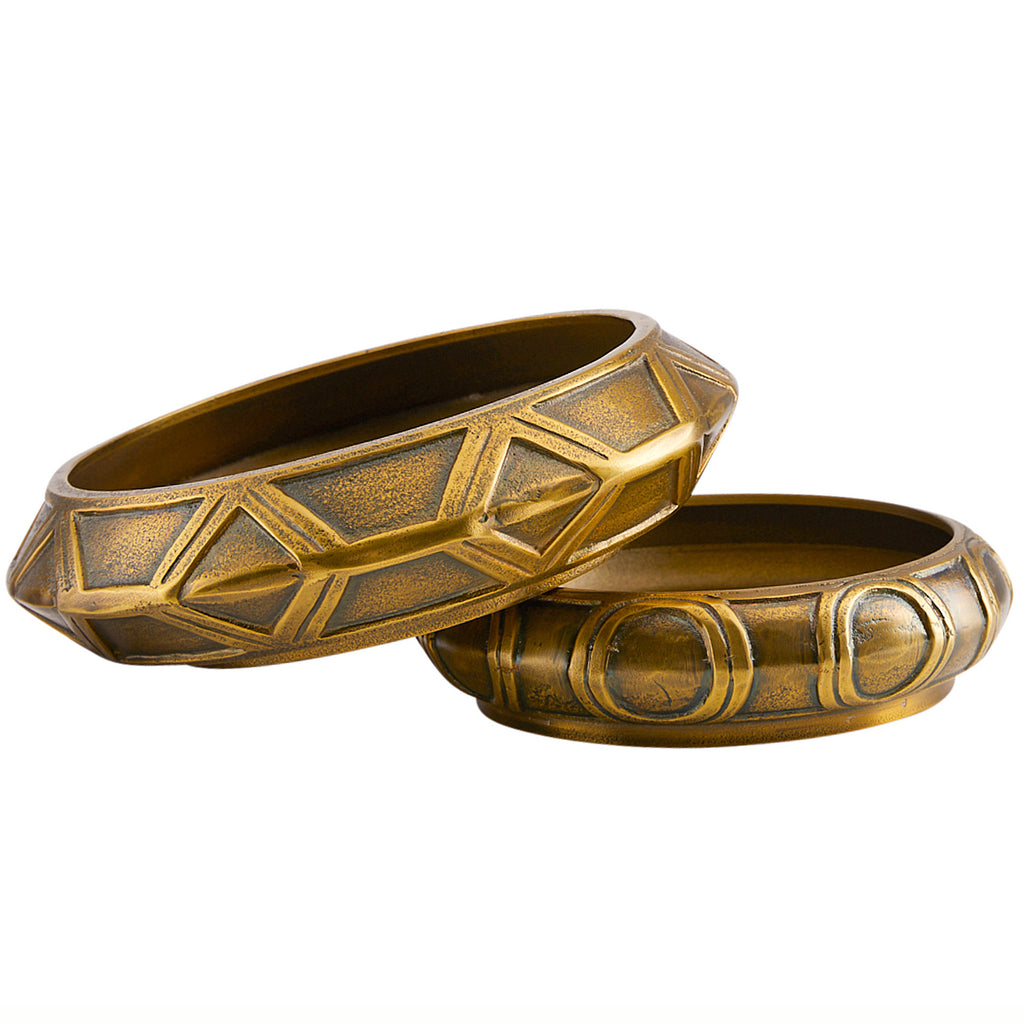The Arteriors Millenia small stacked centerpieces have a visual language that combines art deco and orientalism and are rendered in cast aluminum. These timeless individual pieces are finished in antique brass and are designed to be used and displayed separately or stacked as bowls or trays. The millenia stacked bowls I & ii - are two individual sets for a total of 4 pieces. Finish will vary.