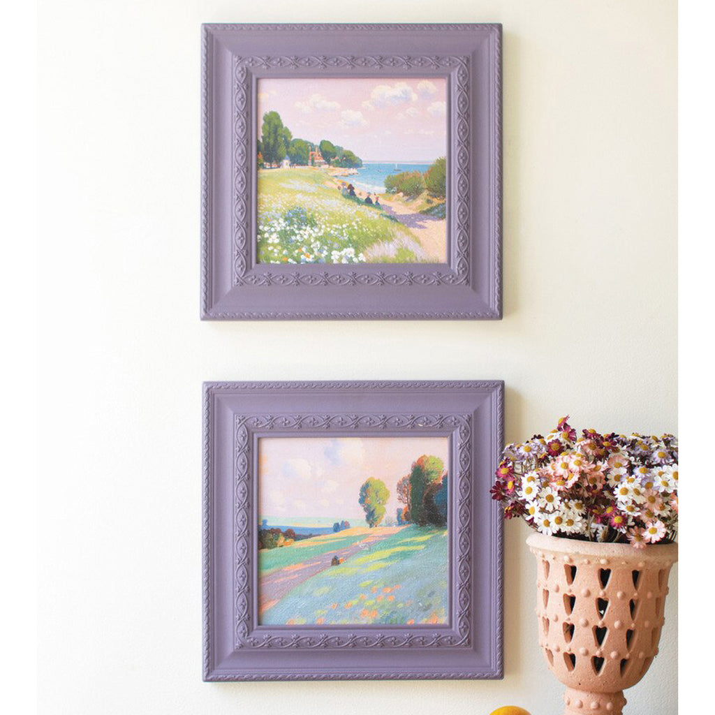 Gaze into the middle distance with this set of two landscape paintings in purple frames. These picturesque prints suit any decor style and make a great gift. Hang them side by side or on either side of a door or window.