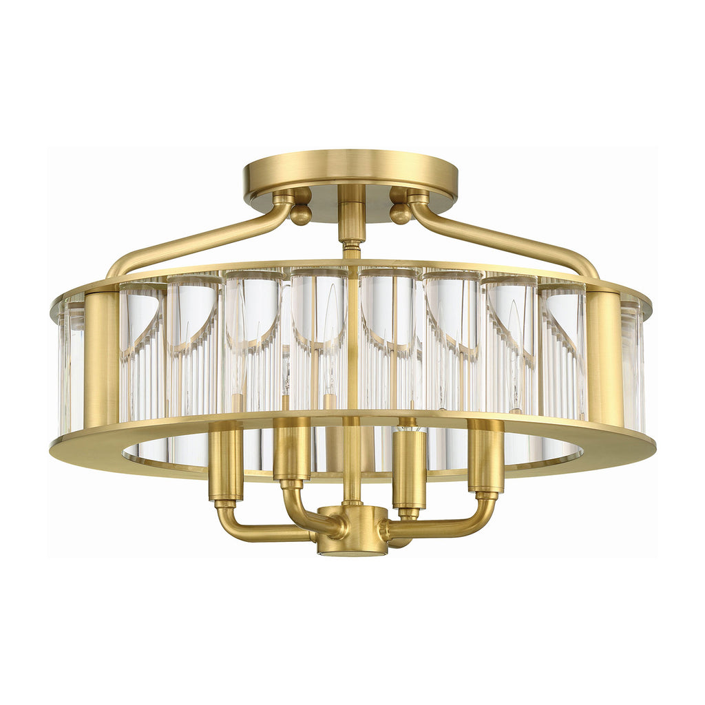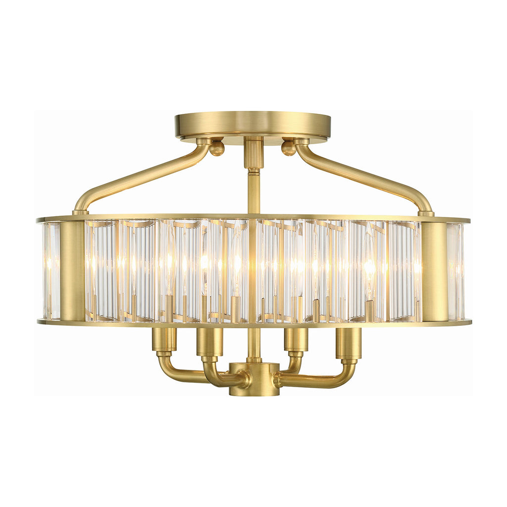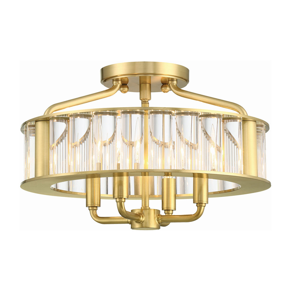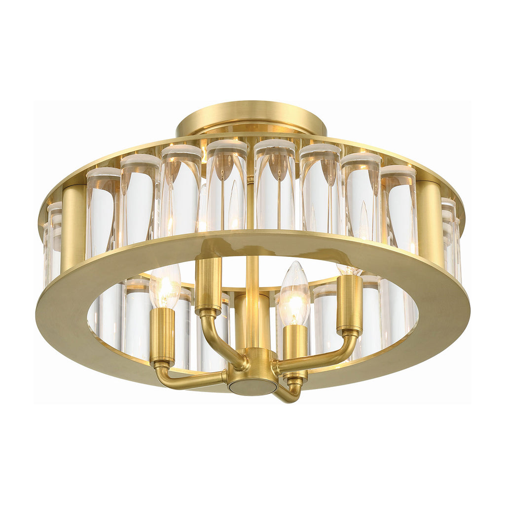 Crystorama is known for its standout lighting, which is exceptional in quality and design. From traditional all-crystal designs to transitional lighting collections, Crystorama offers styles that will match any décor and are always in fashion. The Libby Langdon Farris Semi-flush light comprises solid thick glass rods and a sleek metal frame in a Vibrant Gold brushed finish. The open frame at the top and the bottom of the fixture is airy and light, while the generous diameter of the glass rods gives a substantial and luxurious feel. The center rod that holds the four candelabra light sections drops below the lower round frame just enough to add another dimension and visual interest. The soft slope of the top rods that connect to the upper canopy adds ease and elegance to the overall profile of the Farris semi-flush fixture. The Farris collection is a new contemporary take on a classic crystal chandelier. Farris collection features a versatile transitional design. A marriage of traditional and contemporary equate a classic and timeless design that focuses on simplicity and sophistication. The crystals from the Farris collection, feature a modern and updated way to accentuate any room. Aged Brass metal finish is treated to look aged and have a rich hue. This shade adds a luxurious touch to any room and is perfect for modern and contemporary settings.
