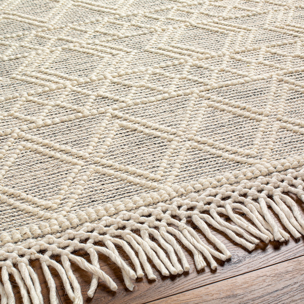 The Hemingway Ivory Hand Woven Rug features compelling global inspired designs brimming with elegance and grace! The perfect addition for any home, these pieces will add eclectic charm to any room! The meticulously woven construction of these pieces boasts durability and will provide natural charm into your decor space. Made with Wool, Polyester in India, and has No Pile. Spot Clean Only.