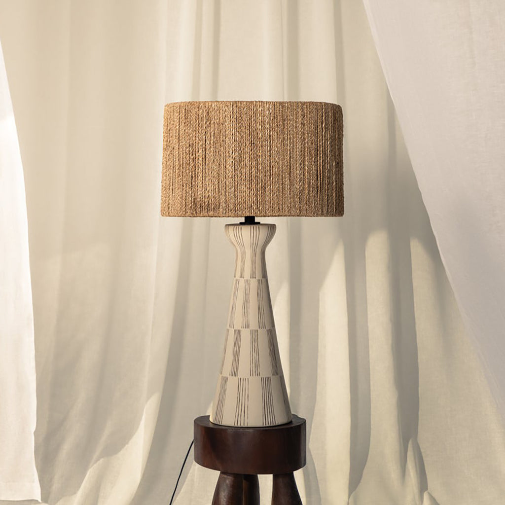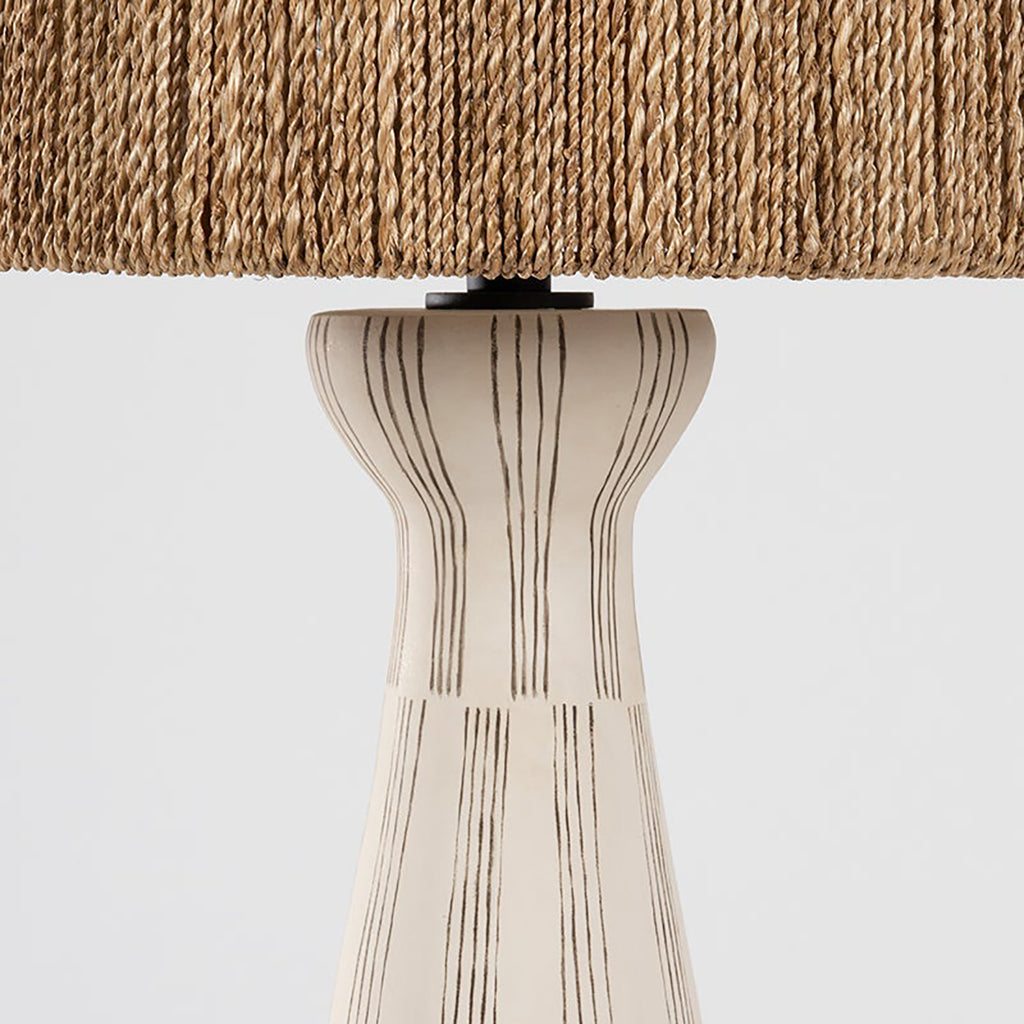Named nostalgically for Nash’s native home in Florida, Troy Palma Table Lamp is designed with a silhouette and textured sides that take cues from the palm tree. The detailed linework on the white ceramic body mirrors the weave on the natural string shade, creating a unified appearance. An exploration of verticality, while honoring its statement-making details. Part of our Loft and Thought collection.